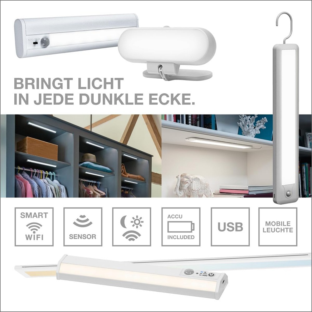 - Verkettung von bis zu 8 Lichtleisten (30cm-Version) und 3 Leuchten (55cm-Version) entweder durch beigefügten Connector für nahtlosen Anschluss oder über beiligendes Verbindungskabel für weitere Entfernungen