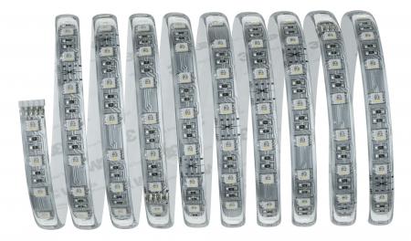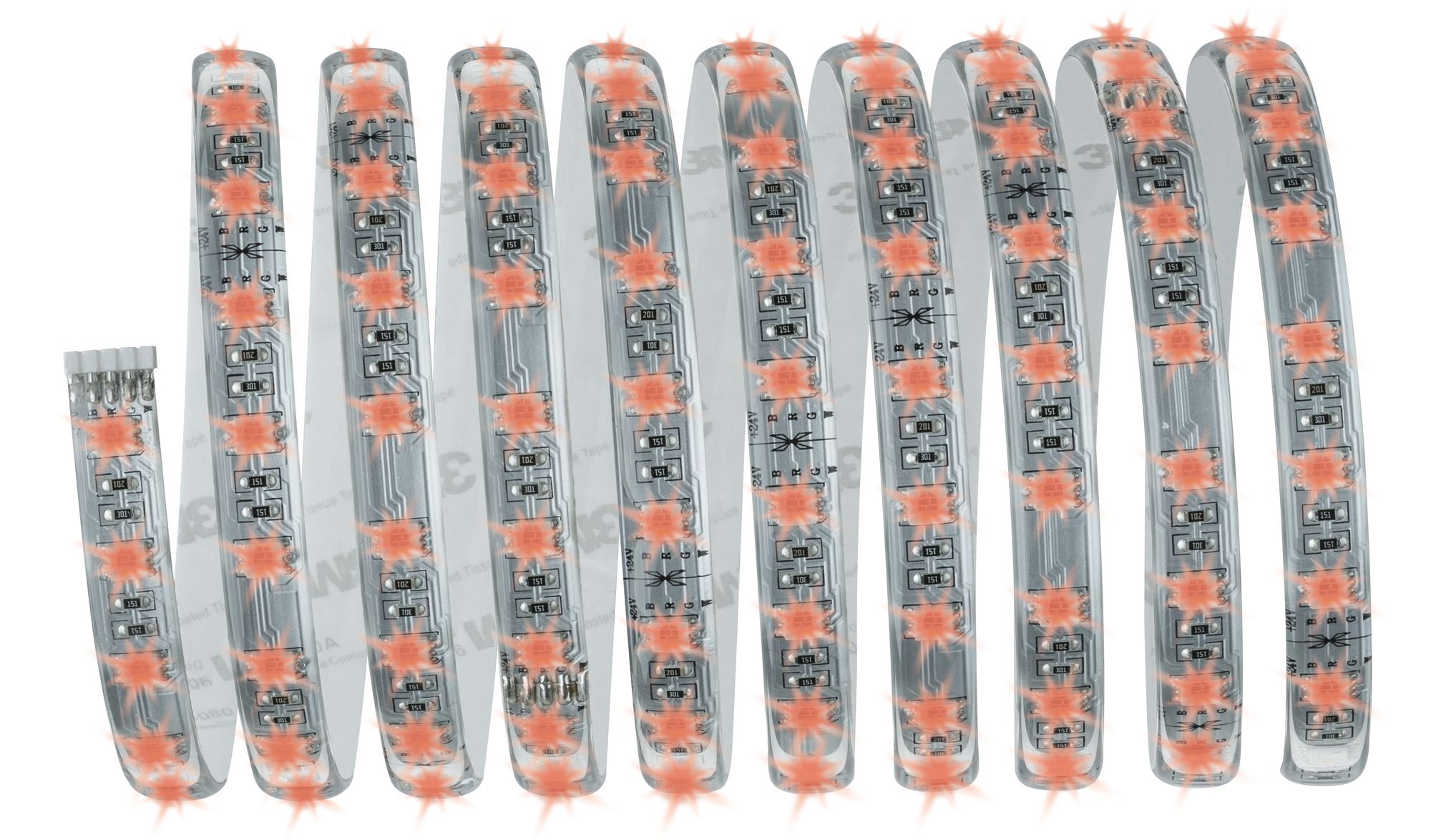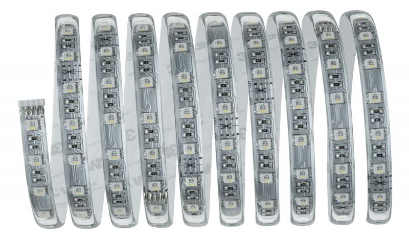 MaxLED-Strips sind mit 36 Watt so leistungsstark, dass sie problemlos zur Raumausleuchtung eingesetzt werden können. Besonders in Profilen sind sie echte Highlights. Dank der stimmungsvollen Farbwechselfunktion schaffen Sie ein individuelles Wohnambiente - von einfarbiger Dauerbeleuchtung bis hin zu mehrfarbigen Lichteffekten ist alles möglich. Eine Diode in Weiß (W) sorgt zusätzlich für wohnliches warmweißes Licht und macht das Mischen eines Weißtons aus den Farben Rot, Grün und Blau (RGB) überflüssig. Das Basisset enthält neben dem Streifen ein passendes Vorschaltgerät und eine Steuerungseinheit mit IR-Fernbedienung. Es lässt sich nach Bedarf mit zusätzlichen Strips und Verbindern erweitern. Bitte beachten Sie bei der Planung die unten angegebene Maximallänge, die nicht überschritten werden darf.