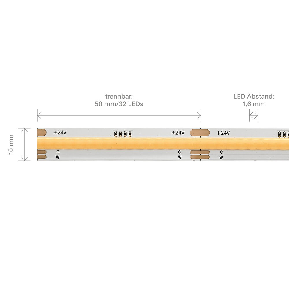 Unser 15W COB LED STREIFEN emittiert homogenes Licht ganz ohne Lichtpunkte. Daher ist er besonders gut geeignet für den Einsatz in sehr flachen Profilen oder bei indirekter Beleuchtung mit geringem Abstand zu reflektierenden Oberflächen. Dies ermöglicht die durchgehende Phosphorbeschichtung.