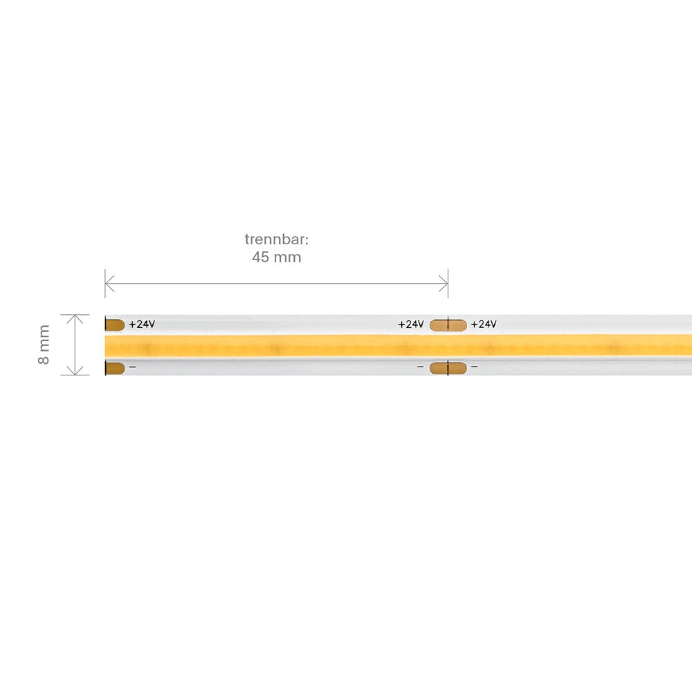 Unser 10W COB LED STREIFEN NARROW emittiert homogenes Licht ganz ohne Lichtpunkte. Daher ist er besonders gut geeignet für den Einsatz in sehr flachen Profilen oder bei indirekter Beleuchtung mit geringem Abstand zu reflektierenden Oberflächen. Dies ermöglicht die durchgehende Phosphorbeschichtung.