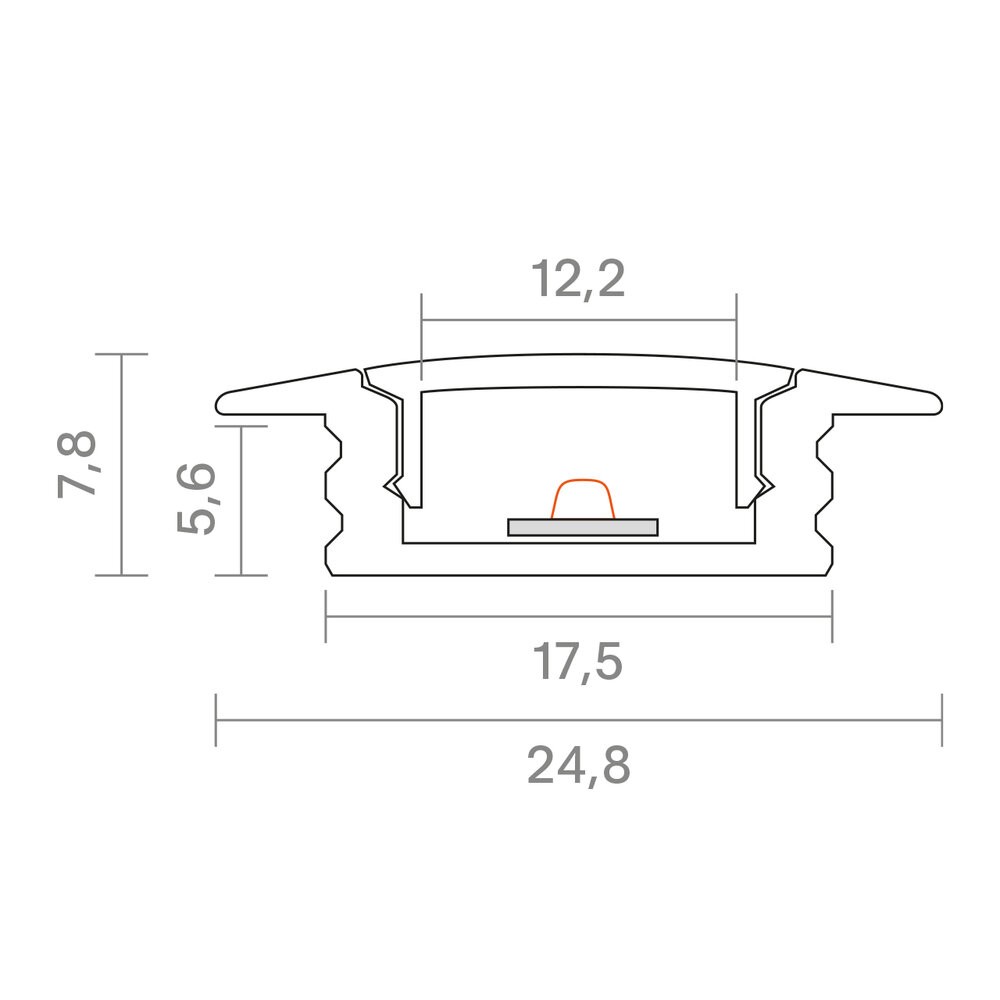 Unser Einbauprofil Flach 12 in der 1m-Variante findet seinen Einsatzbereich an Wand und Decke. Des Weiteren wird es zur Wärmeableitung des LED-Streifen verwendet, wodurch sich die Lebensdauer des verbauten Produktes verlängert. Zusätzlich dient es als Schutz vor Staub und Feuchtigkeit. In Verbindung mit einer opalen Abdeckung wird das Licht gestreut und das Lichtbild deutlich homogener. Alternativ kann auch eine klare Abdeckung verbaut werden. In das Profil können LED-Streifen bis zu einer maximalen Breite von 12,2mm eingebaut werden.