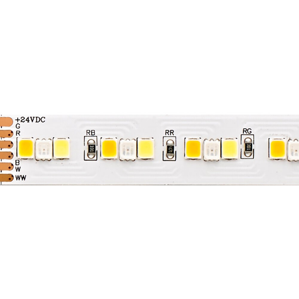 Unser 20 W RGB/TUNABLE WHITE 24 V Streifen setzt Licht- und Farbstimmungen im Objekt um. Zu verschiedenen Zeitpunkten setzen Sie mit dem Band verschiedene Lichtfarben in Szene. Er kann sowohl auf eine unerschöpfliche Farbpalette zurückzugreifen, als auch saubere warm- bis kaltweiße Lichtfarben zum Einsatz bringen.