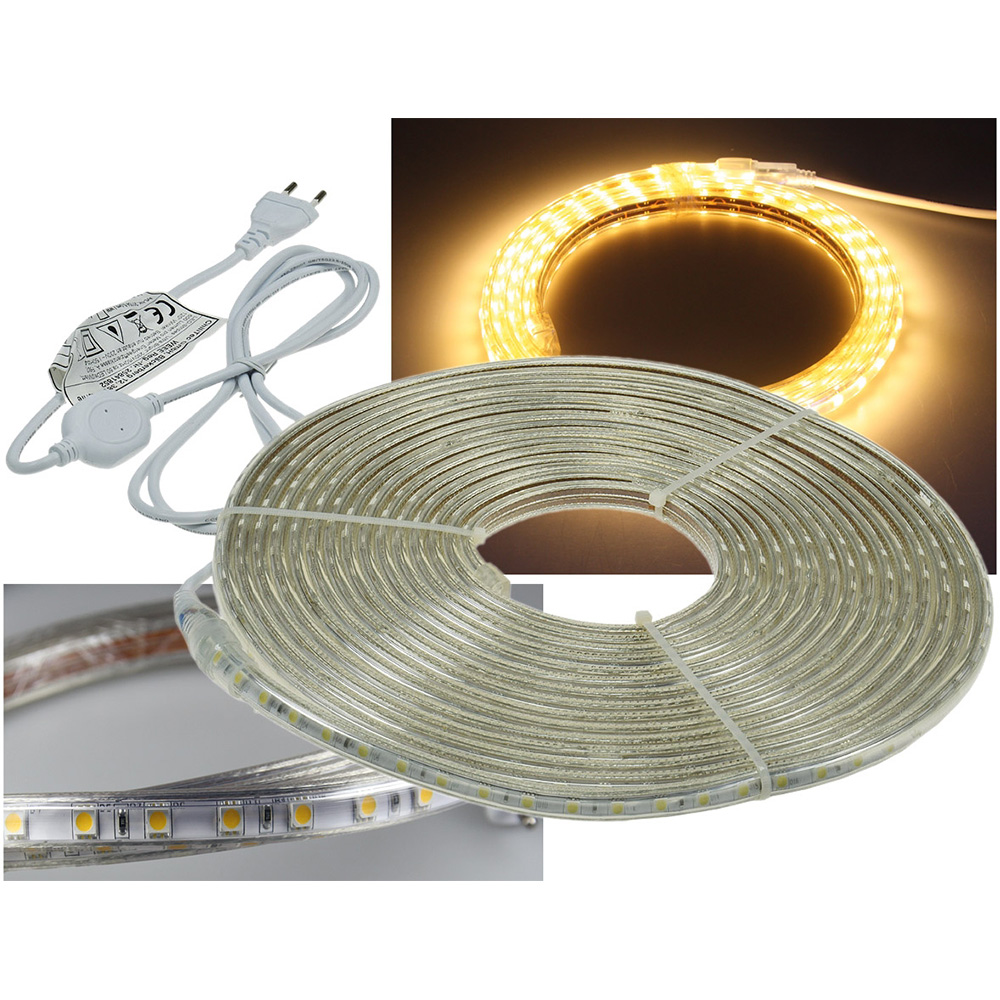 • Lichtausbeute: 600/630 Lumen pro Meter • 60LEDs / 10 Watt pro Meter. • Ready to use - inkl. 230V Einspeisemodul und Befestigungsclips • Stripe IP44 spritzwassergeschützt, Netzkabel IP20, weiße Platine • langlebige und lichtstarke SMD LEDs 5050 • Betrieb mit 230V/50Hz, dimmbar mit Phasenanschnitt (ca. 20-90%), z.B mit Dimmer Art.-Nr. 19721.