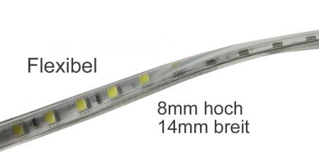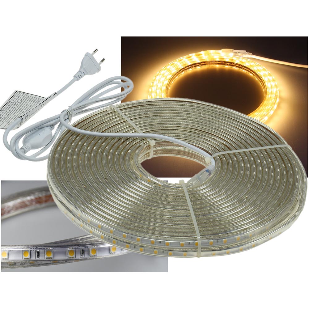 • Lichtausbeute: 600/630 Lumen pro Meter • 60LEDs / 10 Watt pro Meter. • Ready to use - inkl. 230V Einspeisemodul und Befestigungsclips • Stripe IP44 spritzwassergeschützt, Netzkabel IP20, weiße Platine • langlebige und lichtstarke SMD LEDs 5050 • Betrieb mit 230V/50Hz, dimmbar mit Phasenanschnitt (ca. 20-90%), z.B mit Dimmer Art.-Nr. 19721.