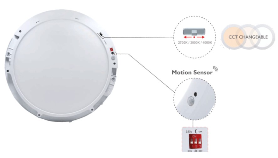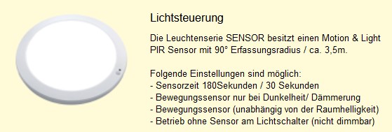 Entdecken Sie das leistungsstarke, preislich attraktive MULTILED SENSOR PANEL mit Motion & Light Sensor. Das flache Panel kann als Aufbauleuchte oder Einbauleuchte (LM 65-205mm) eingesetzt werden. Der Motion & Light Sensor kann auf 30 / 180 Sekunden eingestellt werden. Der PIR Sensorwinkel beträgt 90° (3,5m). Der Sensor kann an/ aus gestellt werden, bei Bewegung die Leuchte einschalten oder die Leuchte erst bei Dunkelheit und Bewegung (Dämmerungssensor) einschalten. Der Sensor kann ausgeschaltet werden und die Leuchte als nicht-dimmbare Leuchte am Lichtschalter betrieben werden.C OLORSWITCH: die Lichtfarbe der Leuchte kann eingestellt werden auf 2700K, 3000K oder 4000K.