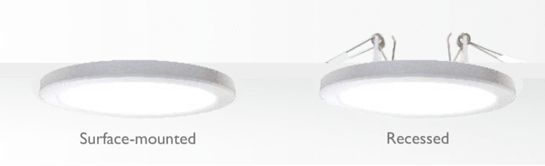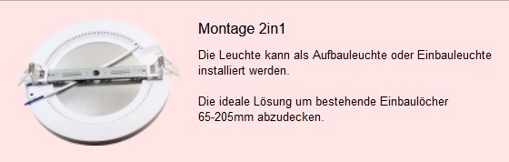Die Leuchte ist besonders flach (18mm) Dank eingebautem Treiber. Das Panel kann als Aufbau- und als Einbauleuchte verwendet werden (Lochmaß 65-205mm).