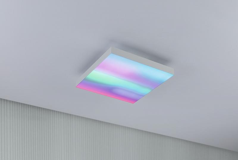 Spektakuläre Lichteffekte im Wohnraum - Das LED Panel Velora Rainbow in Weiß in der Größe 295x295mm verbindet hervorragende Raumbeleuchtung mit purer Farbmagie, denn hier wurden beste Lichteigenschaften mit dynamischen Farbeffekten neu kombiniert. Die Farbtemperatur ist per Fernbedienung stufenlos von 3000 K warmweißem bis 6500 K tageslichtweißem Licht einstellbar und unterstützt den natürlichen Biorhythmus. Das LED Panel verblüfft zudem mit 16 voreingestellten Animationen und dynamischer Farbsteuerung, die so nur mit flächigem Licht möglich sind. Jede Licht-Szene kann in der Geschwindigkeit angepasst oder als Standbild eingefroren werden. So entsteht eine einzigartige und individuelle Leuchtenflächen. Das LED Panel Velora Rainbow ist stufenlos dimmbar und hat eine integrierte Nachtlichtfunktion. Die hochwertige mattierte Lichtfläche und das randlose, elegante Design zeichnen das Panel aus. Die Installation an Wand oder Decke erfolgt über einen Schweberahmen.