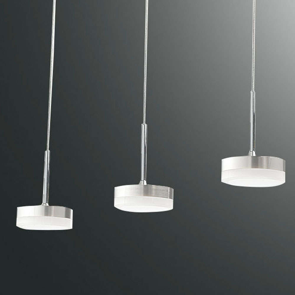 Diese hochwertige Pendelleuchte verzichtet völlig auf überflüssige Schnörkel. Mit ihren insgesamt 3500 Lumen ist sie leistungsstark und vermag einen großen Eßtisch ausreichend zu beleuchten. Das warmweiße Licht der Pendelleuchte wird dank der satinierten Glasoberfläche der Leuchtkörper blendfrei nach unten abgestrahlt. Der Sockel der Leuchte ist 136 cm breit und 8 cm breit.