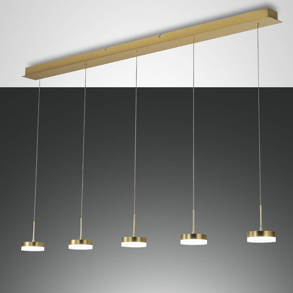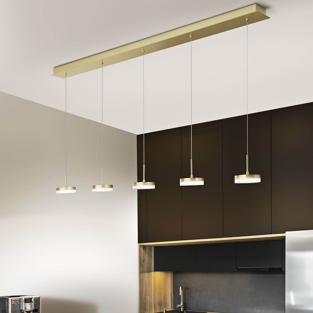 Diese hochwertige Pendelleuchte verzichtet völlig auf überflüssige Schnörkel. Mit ihren insgesamt 3780 Lumen ist sie leistungsstark und vermag einen großen Eßtisch ausreichend zu beleuchten. Das warmweiße Licht der Pendelleuchte wird dank der satinierten Glasoberfläche der Leuchtkörper blendfrei nach unten abgestrahlt. Der Sockel der Leuchte ist 136 cm breit und 8 cm breit.