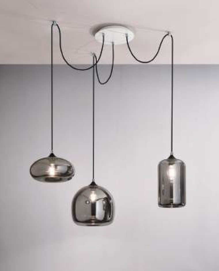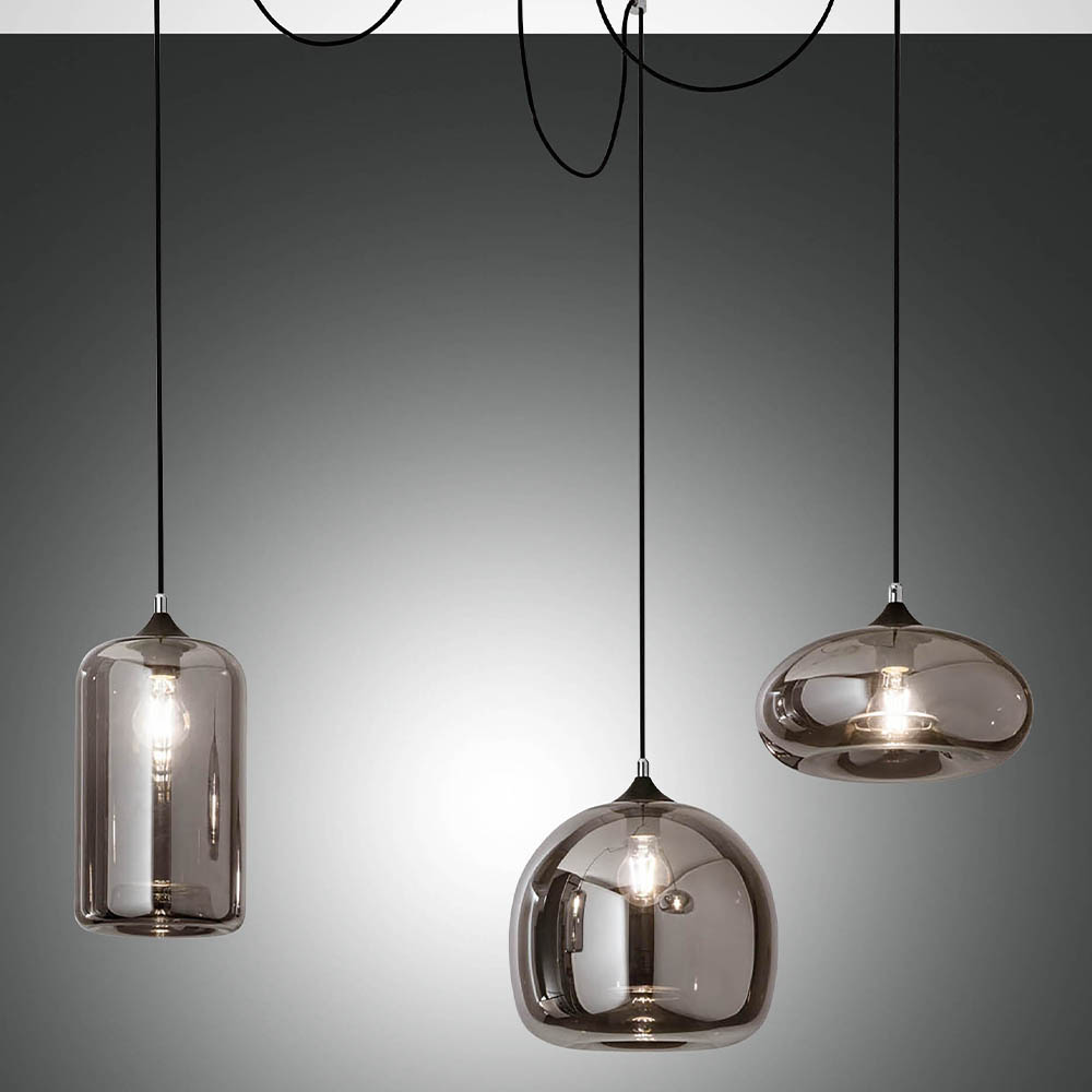 Diese Hängeleuchte FIONA besticht duch ihre weiche Formgebung und drei unterschiedlich geformten Glasschirmen aus Glas, die vereint durch die Rauchglasoptik ein stimmiges Gesamtbeild ergeben. Diese Leuchte wirkt hervorragend über einem Eßtisch, auch in einer Gruppe und verbreitet ein gemütliches mediterranes Flair. Die Gestaltung der Wandleuchte macht diese Lampe zu einem Hingucker in Ihrem Flur, Wohnzimmer oder Eßzimmer. Das Licht wird durch die Rauch Glasoberfläche fein gefiltert und somit als angenehmer empfunden.