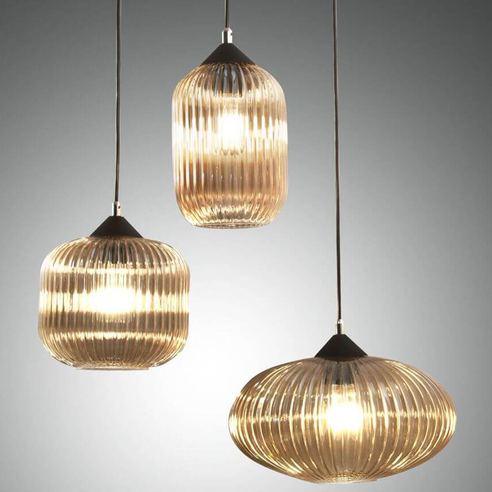 3-flammige Nordal Pendelleuchte Stilmix unterschiedliche Schirmgrößen geriffelt in Amber von Fabas Luce