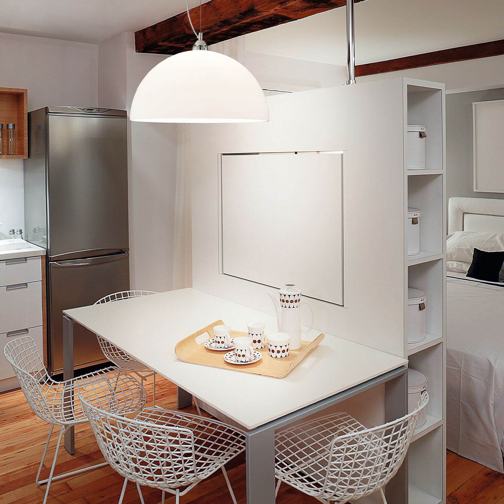 Klassischer kann das Design einer Hängeleuchte kaum sein. Von der matt-silbernen Aufhängung bis zum satinierten Glasschirm ist alles an dieser Leuchte von schlichter Eleganz.
