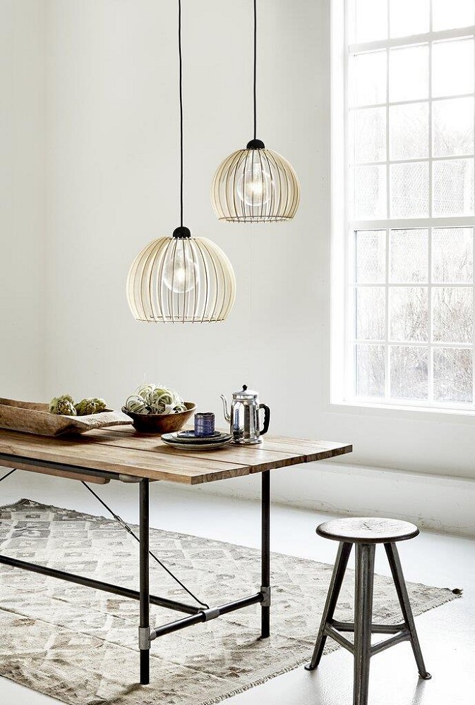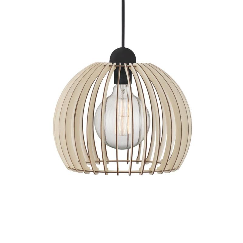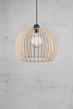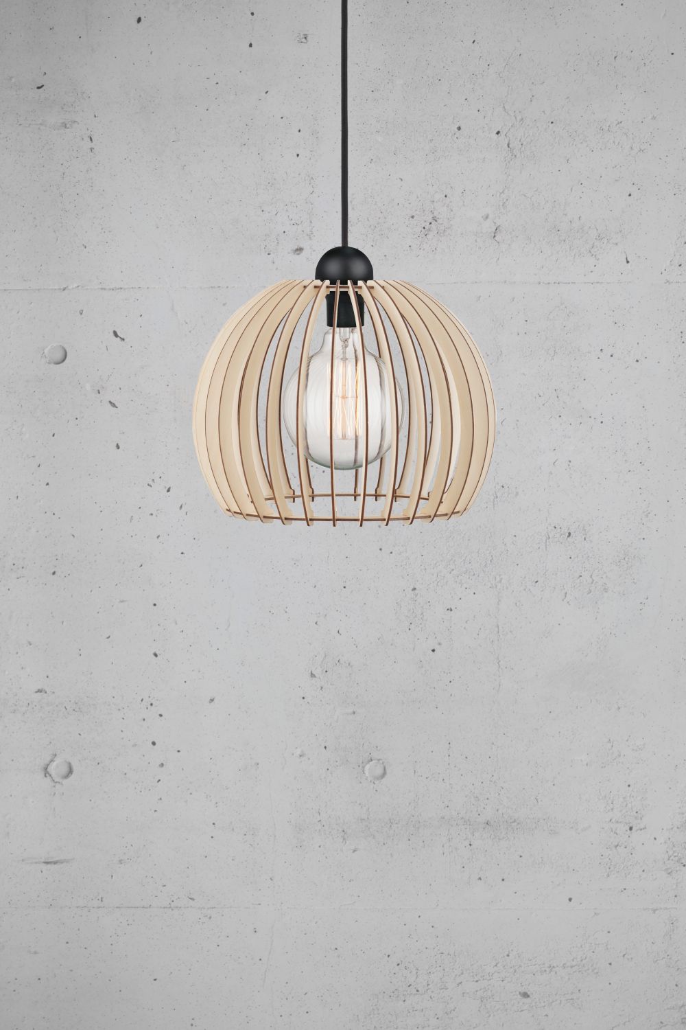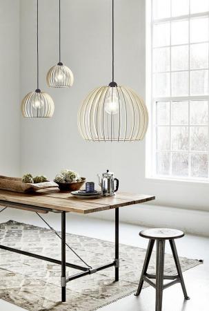Pendelleuchte in einem grafischen Design und mit einem Lampenschirm aus Holzlamellen, die eine angenehme Lichtstreuung bewirken. Weil die Lichtquelle zwischen den Lamellen sichtbar ist, empfiehlt es sich, die Leuchte mit einer dekorativen Glühlampe zu ergänzen. Diese Leuchte ist unter anderem ideal über dem Küchen- oder Esstisch und sie wird ohne Leuchtmittel geliefert. Bitte bestellen Sie ein E27 Leuchtmittel, am besten ein LED-Filament-Leuchtmittel, dazu.