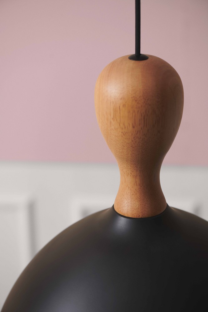 Die geschwungene Form und der Kontrast zwischen Metall und hochwertigem geöltem Massivholz verleihen dieser Leuchte einen einzigartigen puristischen Look. Die Inspiration für das Design stammt von der Sanduhr, einem Objekt mit großem Charme, dessen Sand einst vom Dueodde-Strand in Bornholm (Dänemark) genommen wurde.