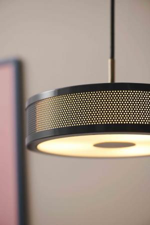 Frame kombiniert in kompaktem Design eine echt effektive Beleuchtung mit Materialien bester Qualität. Die Leuchte hat einen Innenschirm aus Stoff, Messingeffekte und die perforierten Seiten verleihen dieser Lampenserie eine ganz besondere Ästhetik.