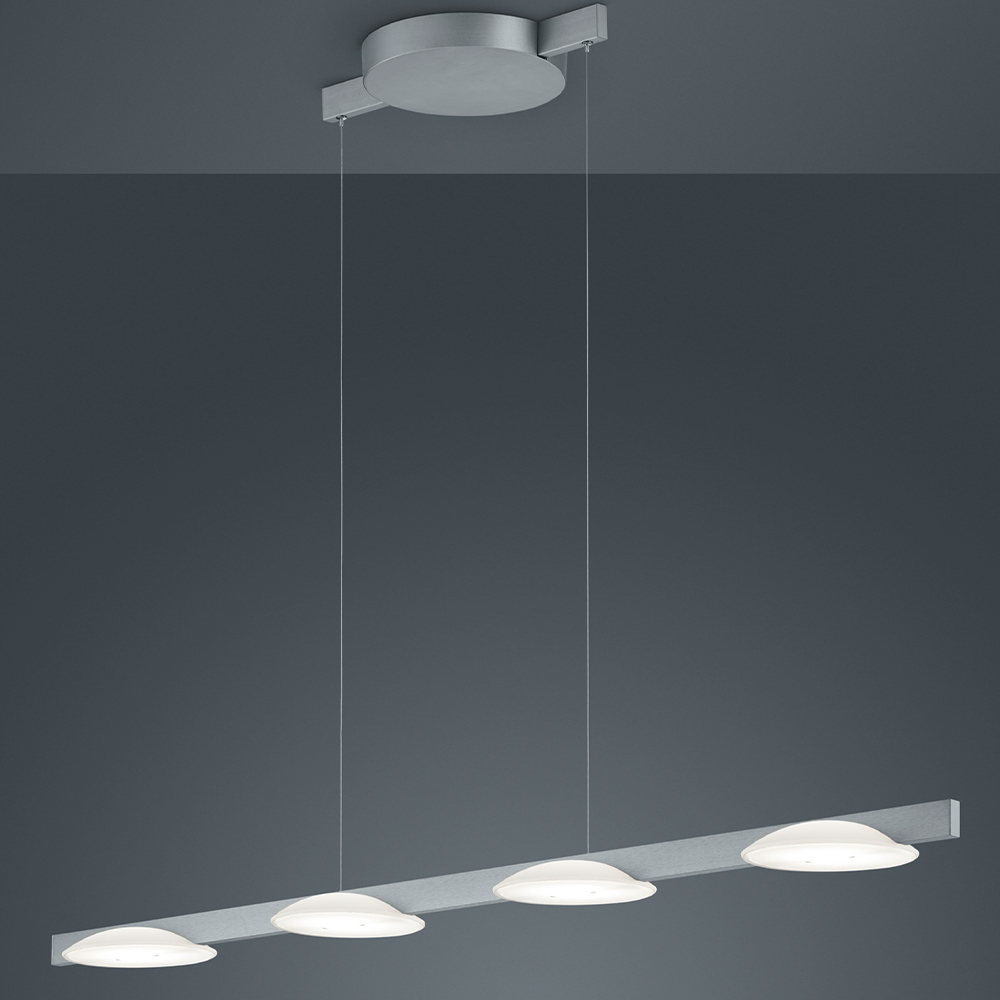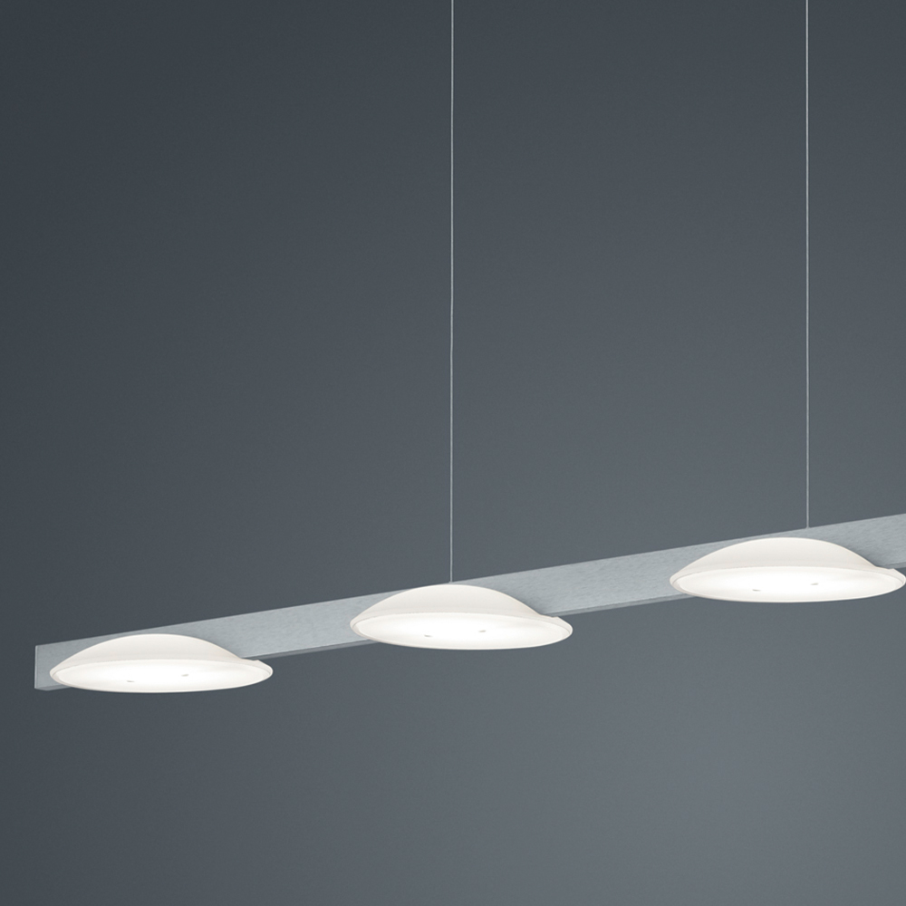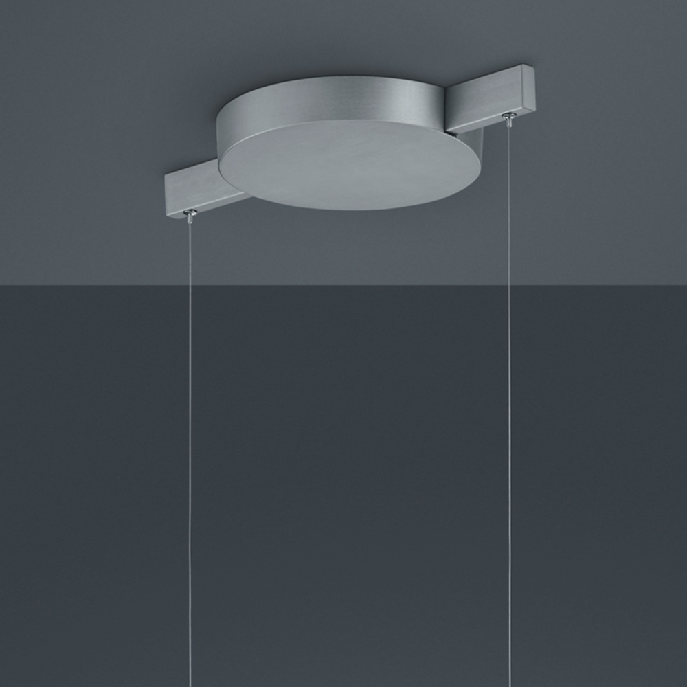 Der ungewöhnlich gestaltete Baldachin der Leuchte sowie das Metallelement, das die drei Schirme hält, sind aus eloxiertem Aluminium gefertigt. Die in den einzelnen Schirmen installierten LEDs sind dimmbar.
