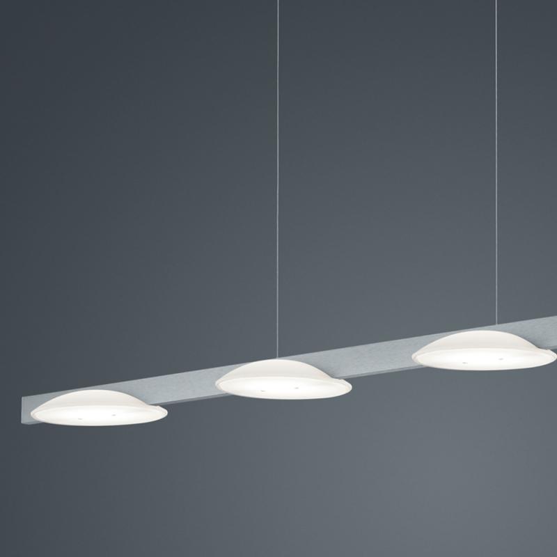 Diese Hängelampe ist ideal für die Beleuchtung eines Tisches in der Küche oder im Esszimmer. Die Leuchte verfügt über drei Lampen, so dass sie einen größeren Raum beleuchten kann als die meisten Pendelleuchten. Das satinierte Glas, aus dem die flachen, nach oben gewölbten Schirme bestehen, lässt das Licht blendfrei und sehr gleichmäßig verteilt durchscheinen und Ihren Raum sowohl von oben als auch von unten beleuchten.