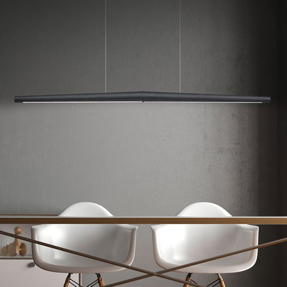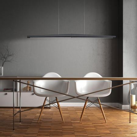 Das Charakteristische an der Leuchte ist ihre Schlichtheit und die Anlehnung an den Flügelschlag von Möwen. Sie ist aus Aluminium gefertigt und mit einem matten Finish versehen. Die satinierte Abdeckung aus Acryl sorgt dafür, daß das Licht nach unten sanft gestreut wird, um die unterhalb gelegene Tischfläche gleichmäßig und blendfrei zu erhellen.