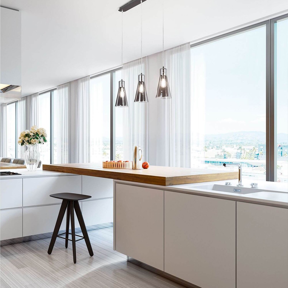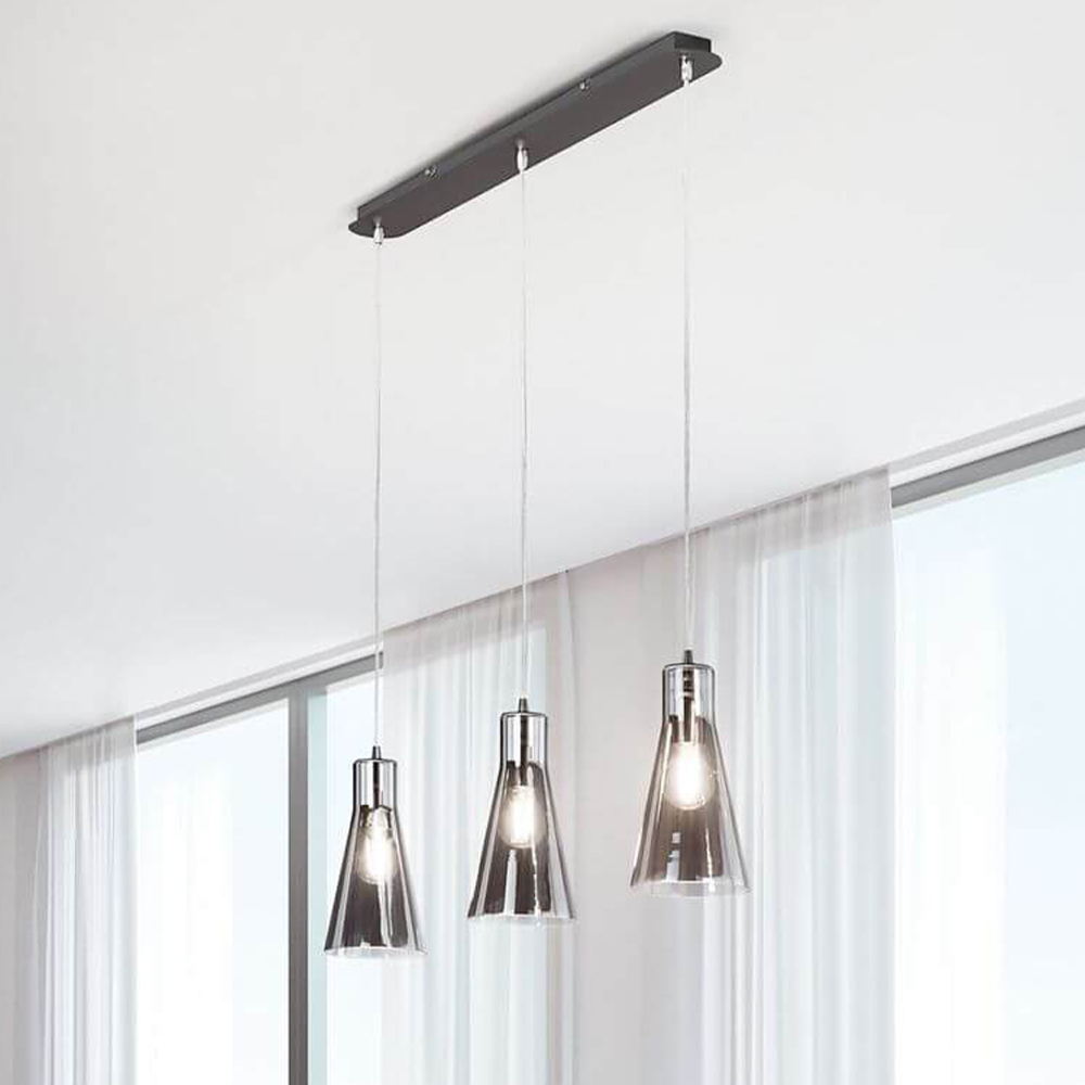 Die Bretagna-Pendelleuchte ist eine schlanke Glas-Pendelleuchte. Die Hängeleuchte ist mit drei E27-Fassungen ausgestattet, so dass sie mit einer Vielzahl von E27-Lampen für eine individuelle Beleuchtung betrieben werden kann.