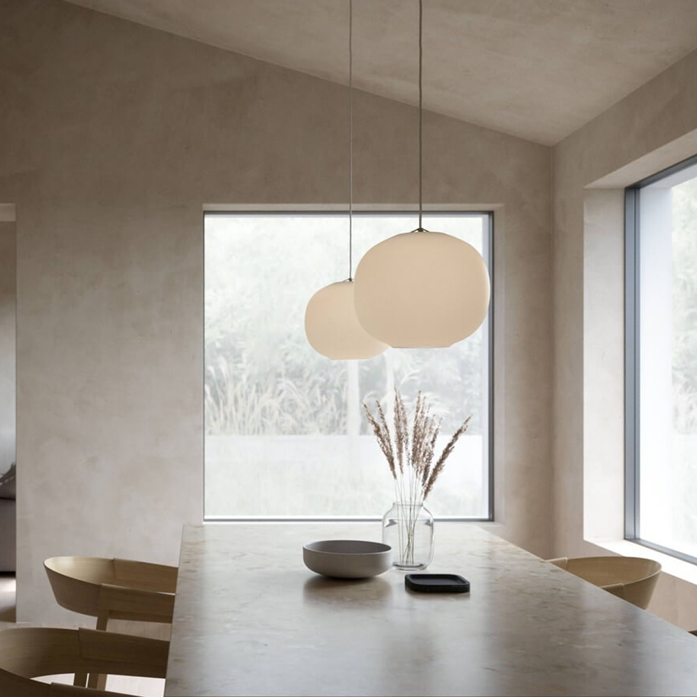 Navone wurde vom dänischen Designstudio Mavro/Lefevre entworfen. Die Gesamtform des Lampenschirms ist weich und rund, doch der subtil gebogene untere Teil verleiht der Leuchte eine neue interessante Dimension, die sie zu mehr macht als nur zu einer Kugel. Die Messingdetails sorgen für einen zeitgemäßen Touch und unterstreichen die schwebende Leichtigkeit der Leuchte.