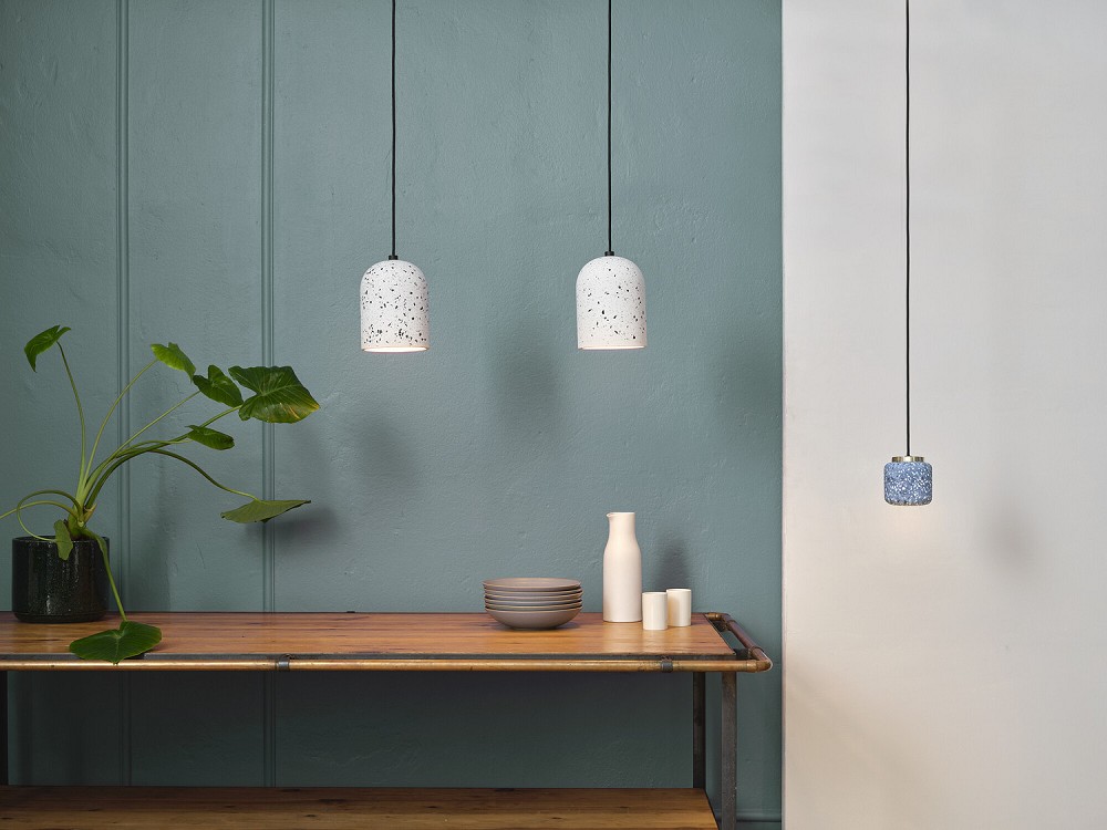Mobile Preview: Pendelleuchte Decor Pill aus Terrazzo Stein mit E27 Fassung in Weiß gesprenkelt Ø 15 cm