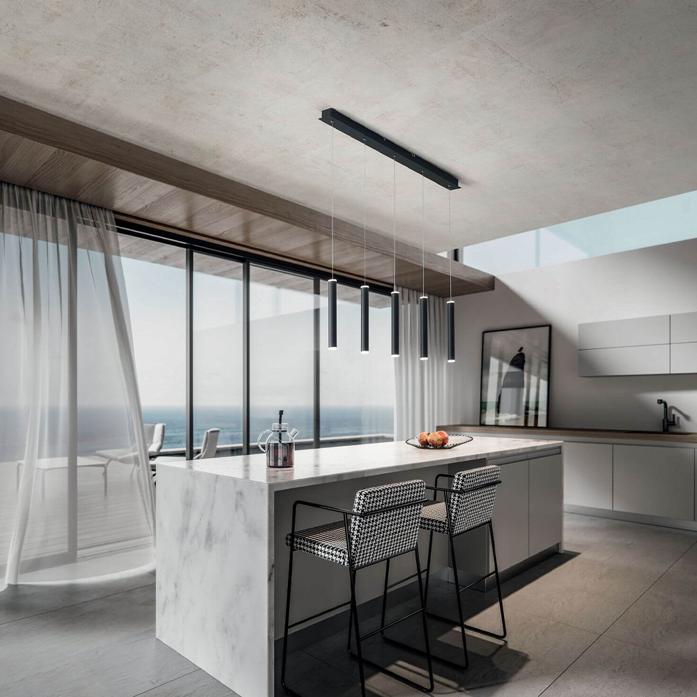 Prado ist eine Pendelleuchte mit einem eleganten, röhrenförmigen Design. Sie verfügt über ein Ober- und Unterlicht und kann bei der Installation in der Höhe verstellt werden. Der Dimmvorgang erfolgt in 3 Stufen über einen vorhandenen Wandschalter (inkl. Memory-Funktion). Sie verfügt über eine gute Farbwiedergabe und eignet sich daher perfekt für die Zonenbeleuchtung über Tischen, Theken und Arbeitsflächen.