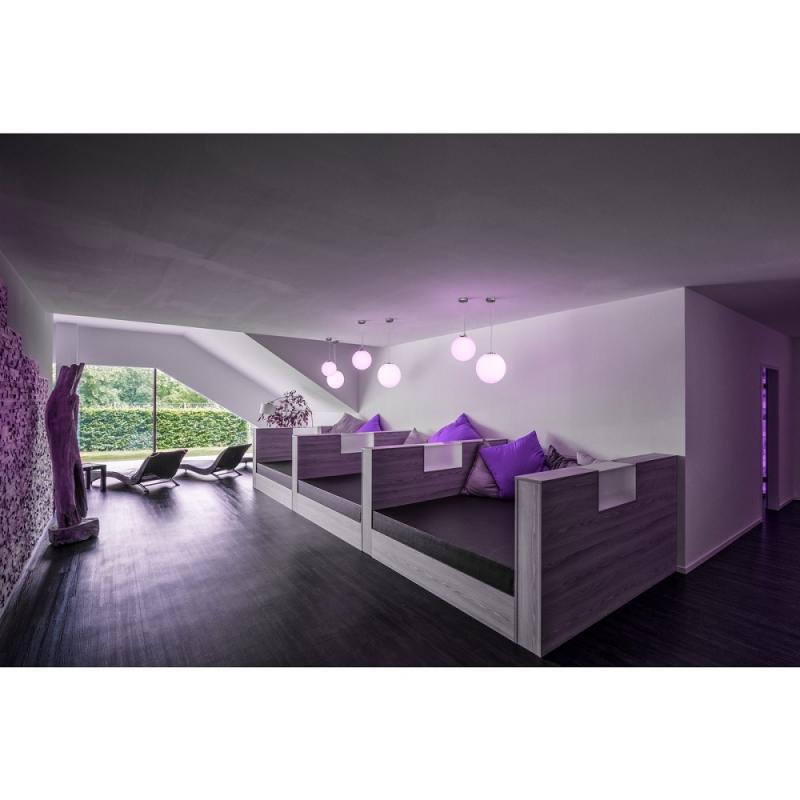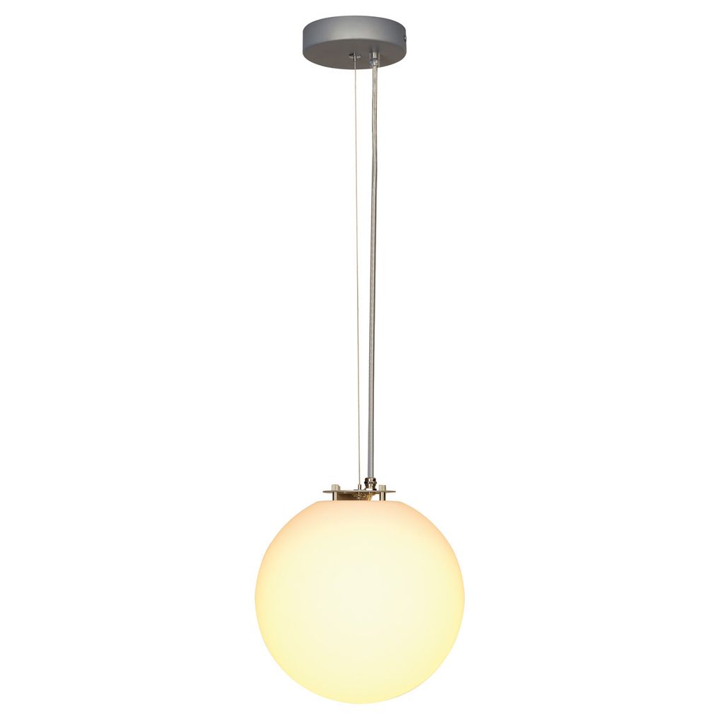 Die kugelförmige Hochvolt Pendelleuchte ROTOBALL 25 besteht aus einem Leuchtenschirm aus temperaturbeständigem Kunststoff, der optisch mit einer Halterung aus silbergrauem Stahl abgerundet wird. Der voluminöse Leuchtenschirm sorgt für homogene Ausleuchtungseigenschaften des zum Einsatz gebrachten Energiespar- oder LED-Leuchtmittels mit handelsüblicher E27 Fassung. Eine passende Deckenrosette ist bereits im Lieferumfang enthalten. Die ROTOBALL 25 Pendelleuchte ist somit fertig für den direkten Anschluss an 230V Netzspannung.