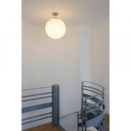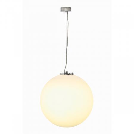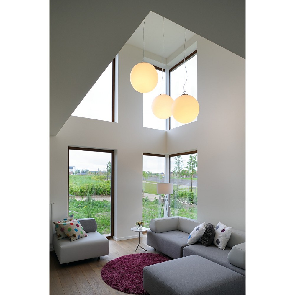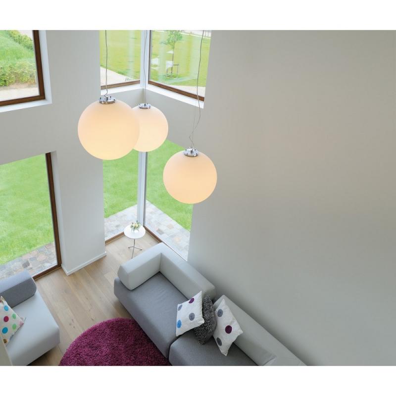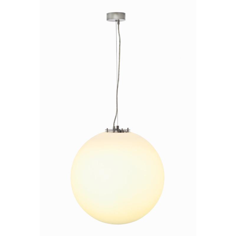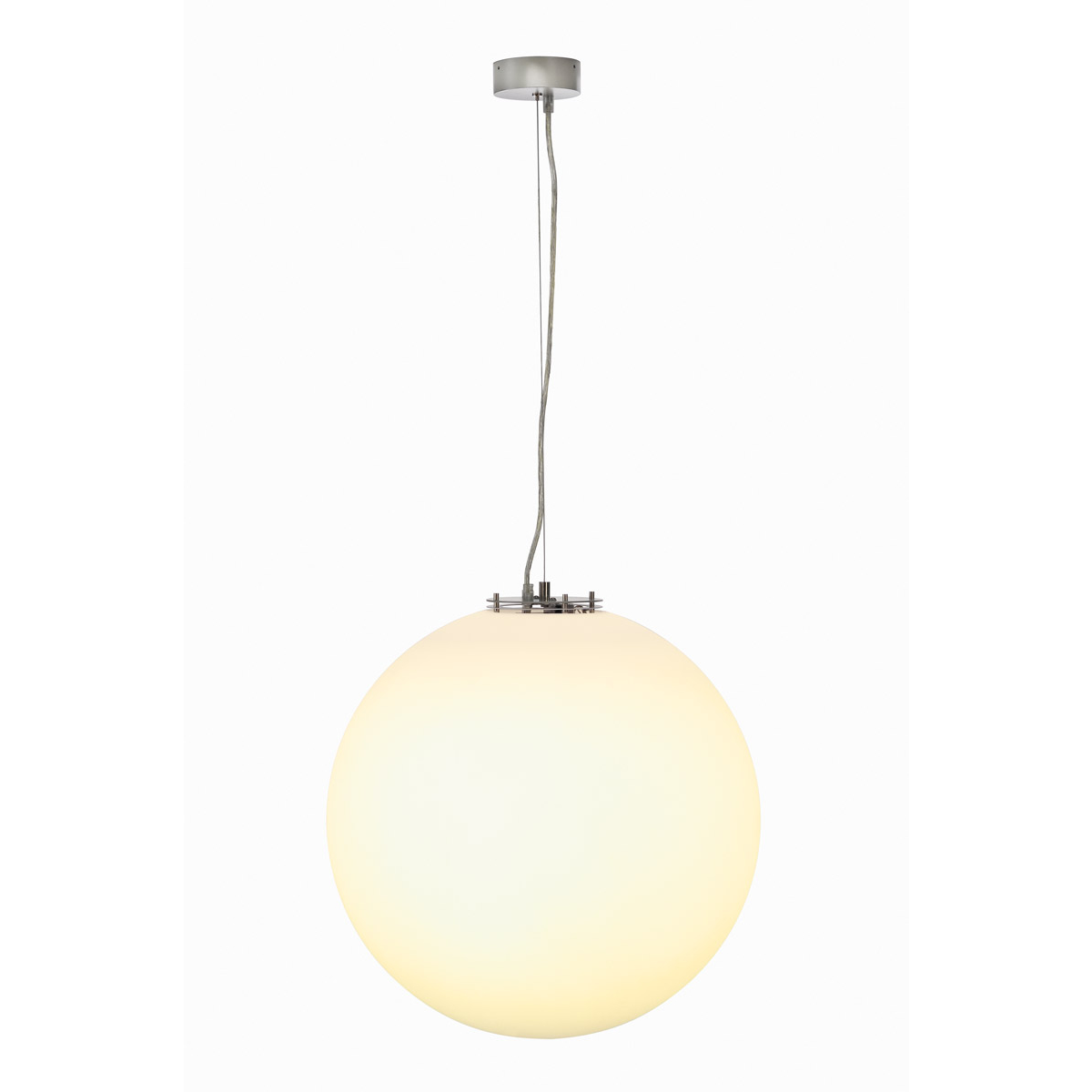Die kugelförmige Hochvolt Pendelleuchte ROTOBALL besteht aus einem Leuchtenschirm aus temperaturbeständigem Kunststoff, der optisch mit einer Halterung aus silbergrauem Stahl abgerundet wird. Der voluminöse Leuchtenschirm sorgt für homogene Ausleuchtungseigenschaften des zum Einsatz gebrachten Energiesparleuchtmittels mit handelsüblicher E27 Fassung. Eine passende Deckenrosette ist bereits im Lieferumfang enthalten. Die ROTOBALL Pendelleuchte ist somit fertig für den direkten Anschluss an 230V Netzspannung. Diese Leuchte ist geeignet für Leuchtmittel der Energieklassen: A - A+