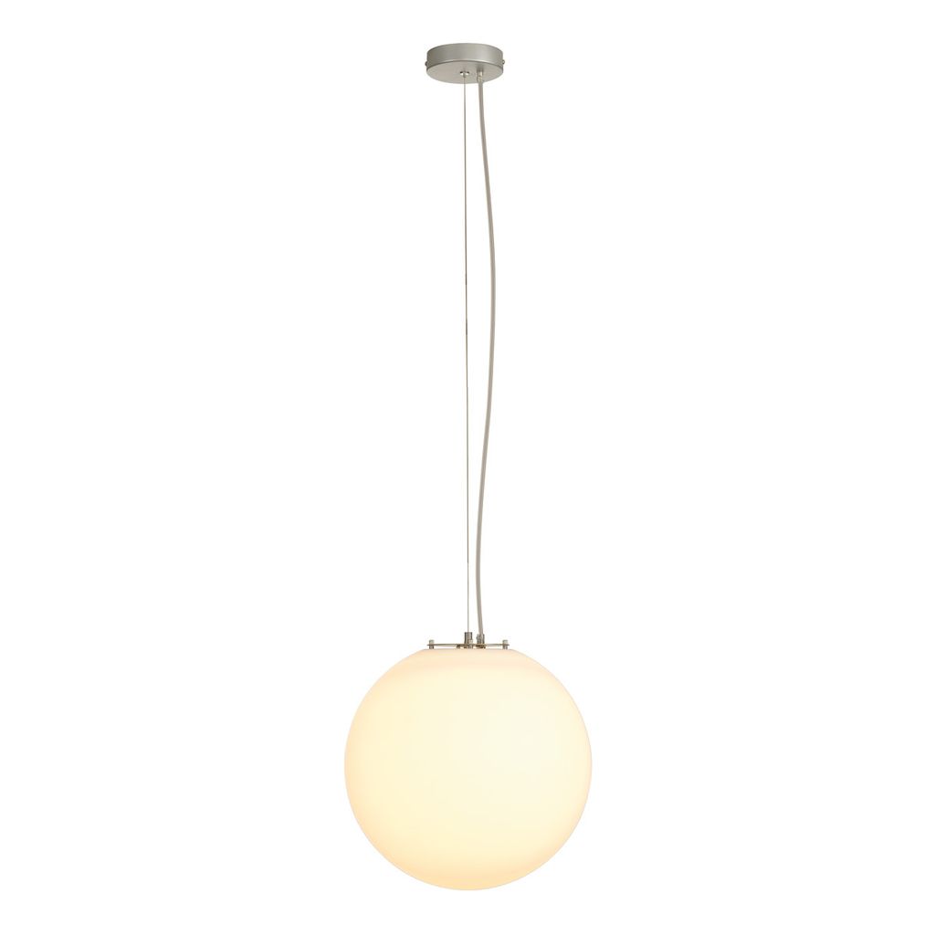 Die kugelförmige Hochvolt Pendelleuchte ROTOBALL 40 besteht aus einem Leuchtenschirm aus temperaturbeständigem Kunststoff, der optisch mit einer Halterung aus silbergrauem Stahl abgerundet wird. Der voluminöse Leuchtenschirm sorgt für homogene Ausleuchtungseigenschaften des zum Einsatz gebrachten Energiesparleuchtmittels mit handelsüblicher E27 Fassung. Eine passende Deckenrosette ist bereits im Lieferumfang enthalten. Die ROTOBALL 40 Pendelleuchte ist somit fertig für den direkten Anschluss an 230V Netzspannung. Diese Leuchte ist geeignet für Leuchtmittel der Energieklassen: A - A+
