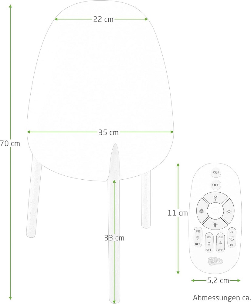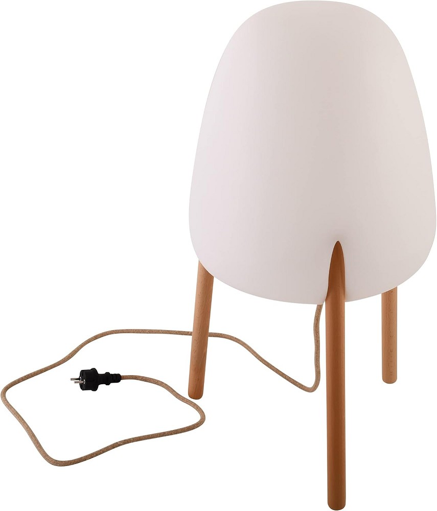 Die Rocket ist eine dekorative Lampe mit Holzbeinen*, die sich ideal als dezente Beleuchtung des Außen- und Innenbereichs eignet. Die Kombination aus Holz und Polyethylen macht dieses Produkt zu einem einzigartigen Möbel- und Beleuchtungsobjekt eines modernen Hauses. Charakteristika: In & Out-Finish, einschließlich Fernbedienung mit Ein- und Ausschalter, Dimmer und Lichtfarbtemperaturänderung. Stilsicher fügt sich die ROCKET in verschiedenste Interieurs ein und schafft mit dem warmweißen oder kaltweißen Licht eine angenehme Wohlfühlatmosphäre. Das Holz ist für den Außenbereich extra behandelt. Das Kabel besteht aus einem Hanfseil. Diese Leuchte kann aufgrund des IP65-Schutzes im Außen- und Innenbereich verwendet werden.