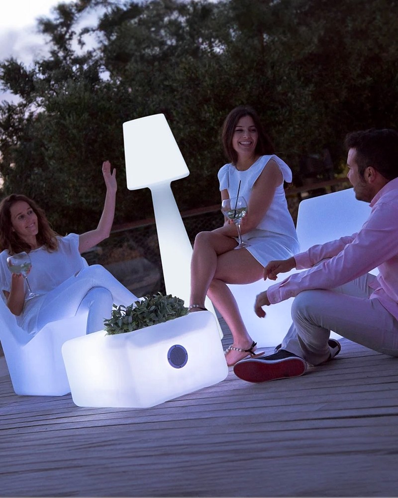 Die Stehlampe LOLA 165 (ø45 x 165 cm) ist eine Ikone der NEWGARDEN-Produktlinie. Mit ihrer außergewöhnlichen Formgebung und dem minimalistischen Design ist sie europaweit beliebt und eine begehrte Außenleuchte für laue Sommerabende im Garten oder der Terrasse. Das Licht, das per Fernbedienung gesteuert und gedimmt werden kann, wird durch eine RGBW-LED mit 128-Farbvariationen erzeugt. Die formschöne Ouroorleuchte LOLA ist in verschiedenen Größen und Ausführungen erhältlich und kann optional auch für festliche Anlässe im Innenbereich, beispielweise als Blickfang und dezente Beleuchtung in einer Empfangshalle, hervorragend positioniert werden. Die Leuchte wurde aus Polyethylen gefertigt, wodurch sie äußerst widerstandsfähig gegen extreme Temperaturschwankungen ist. Sie ist zudem vor UV-Strahlen geschützt, wodurch eine hohe Lebensdauer des Produkts zu erwarten ist. Diese Leuchte kann aufgrund des IP65-Schutzes im Außen- und Innenbereich verwendet werden.