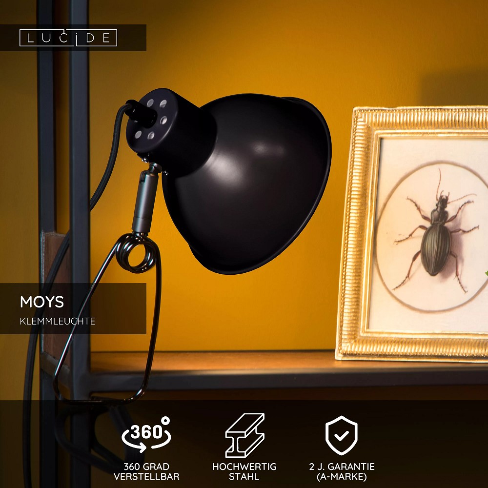 Die Klemmleuchte ist für Situationen konzipiert, in denen gezieltes Licht benötigt wird, ohne eine feste Installation vorzunehmen. Durch die robuste Klemme kann sie sicher an verschiedenen Oberflächen befestigt werden und bietet dadurch maximale Flexibilität im Einsatz. Der Leuchtenkopf lässt sich um 360 Grad drehen und schwenken, wodurch das Licht präzise ausgerichtet werden kann. Das moderne Gehäuse aus Stahl sorgt für Stabilität und eine langlebige Nutzung, während das schlichte schwarze Design sich unauffällig in unterschiedliche Einrichtungsstile einfügt. Die Bedienung erfolgt komfortabel über den integrierten Kabelschalter, was die Nutzung besonders alltagstauglich macht.