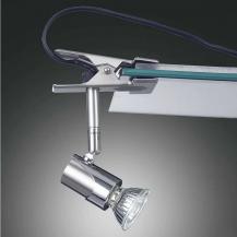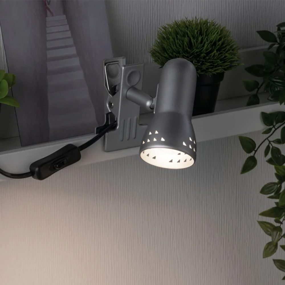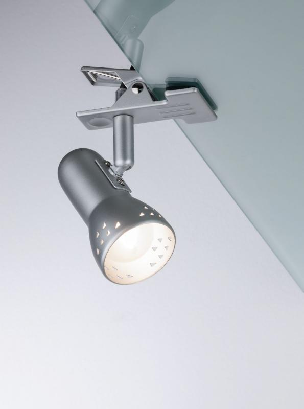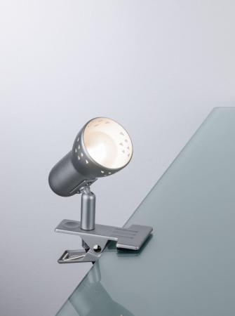Der Klemmspot Gryps in Eisen gebürstet kann je nach Möglichkeit an einem Tisch oder Regal festgeklemmt werden. Da die Leuchte ohne Leuchtmittel ausgeliefert wird kann frei zwischen R50 Reflektorlampe konventionell, LED, ESL oder einer R50 Reflektorlampe mit Halogen Technik entschieden werden.