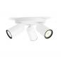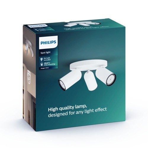 Der Philips myLiving LED Spot PONGEE 3-fach schwenkbarer Deckenstrahler in Weiß ist eine Leuchte, die aus drei zylindrischen Strahlern besteht, die alle um ihre eigene Achse gekippt und gedreht werden können. Die Strahler sind an einer runden Halterung befestigt.