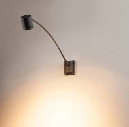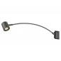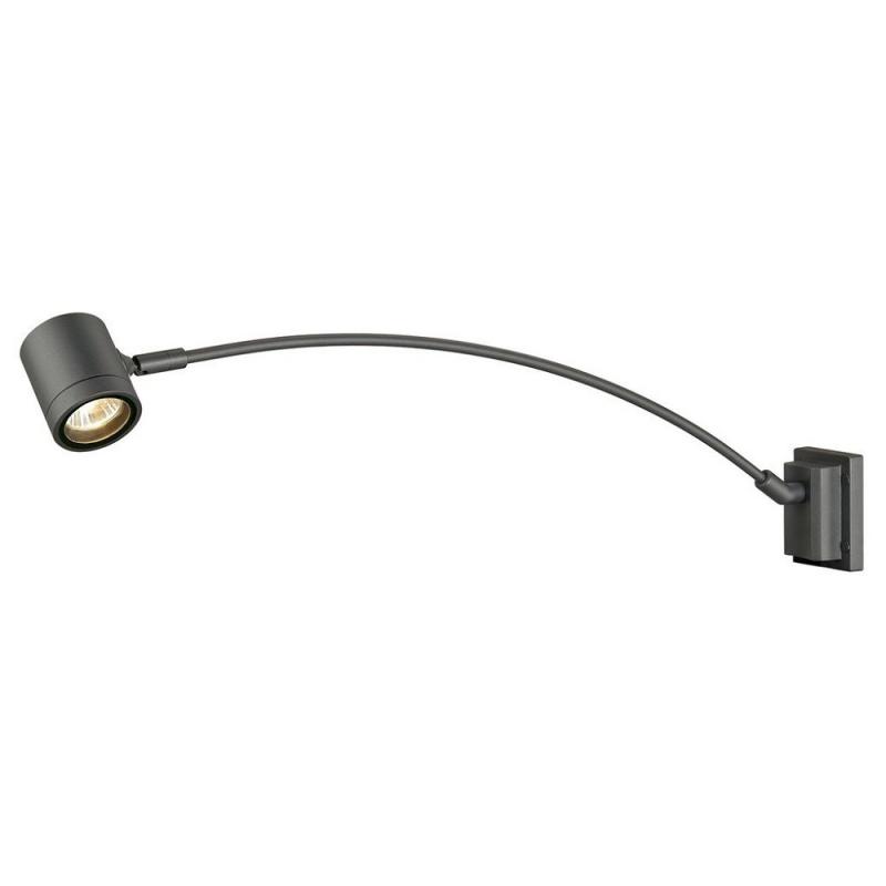 Die gewölbte Displayleuchte besteht aus lackiertem Aluminium und Glas welches das Leuchtmittel abdeckt. Der am gebogenen Ausleger montierte Leuchtenkopf ist dreh- und schwenkbar. Durch die Schutzart IP55 ist sie für den Außenbereich geeignet. Der elektrische Anschluss der in mehreren Farbversionen verfügbaren Leuchte erfolgt an 230V Netzspannung.