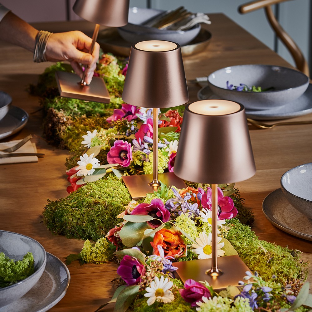Egal, ob gemütlicher Leseabend im Wohnzimmer oder Sommernacht mit Freunden auf der Terrasse: Die goldfarbene wiederaufladbare NUINDIE ist überall dabei. Ihr leistungsstarker Akku und die Einsatzmöglichkeiten im Innen- und Außenbereich machen sie unabhängig von Steckdosen – und damit zur perfekten Wahl für Spontane und Freigeister. Durch ihre hochwertige Verarbeitung und das solide Gewicht hält sie vielem stand – auch wenn es bei der Gartenparty mal hoch hergeht. Ihr warmweißes Licht verströmt ein behagliches Ambiente und ist stufenlos dimmbar.