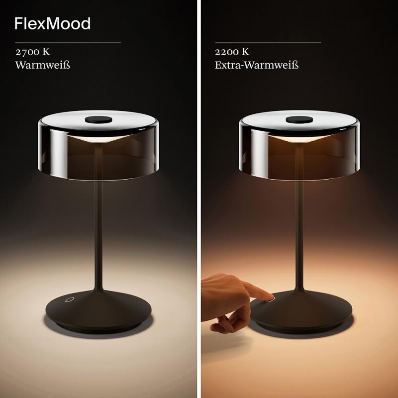 Stimmungsvoll: Das FlexMood-Feature bietet über den Touch-Dimmer warmweißes und blendfreies Licht in zwei Farbtemperaturen (2.700 K und 2.200 K). So verbreitet sie jederzeit die passende Lichtatmosphäre - auch als Nachttisch- oder Leselampe.