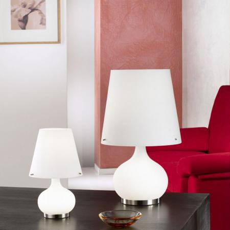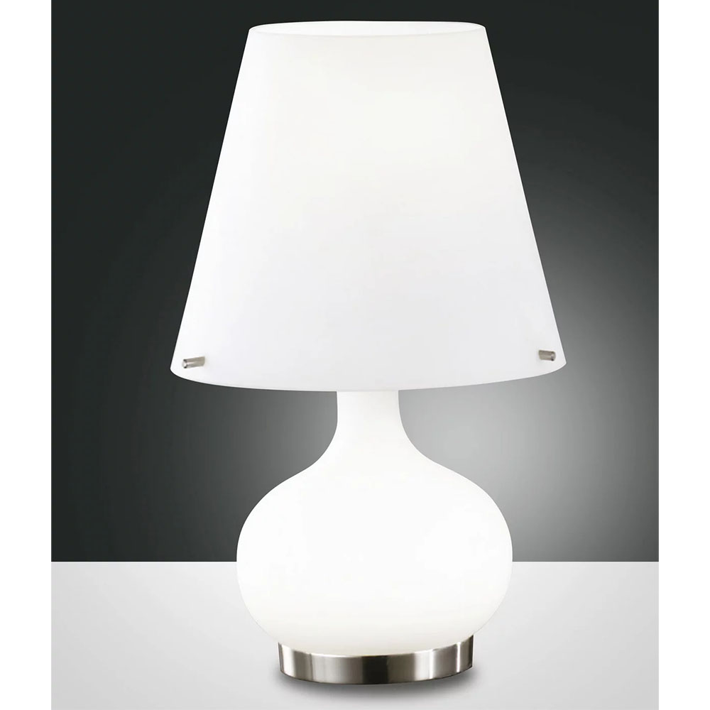 Elegante Designerleuchte für den Tisch mit einem formvollendet geschwungenen Lampenfuß und zylindrischen Lampenschirm. Die Leuchte verfügt über zwei Fassungen - E14 für den Füß und G9 für den oberen Bereich. Dadurch sind zwei verschienende Lichteinstellungen möglich, die optisch unterschiedlich wirken. Der Schirm und der Fuß sind aus hochwertig geblasenem Glas gefertigt. Abgerundet wird der stillvolle Auftritt der Tischleuchte ADE durch den silbernen Standfuß.