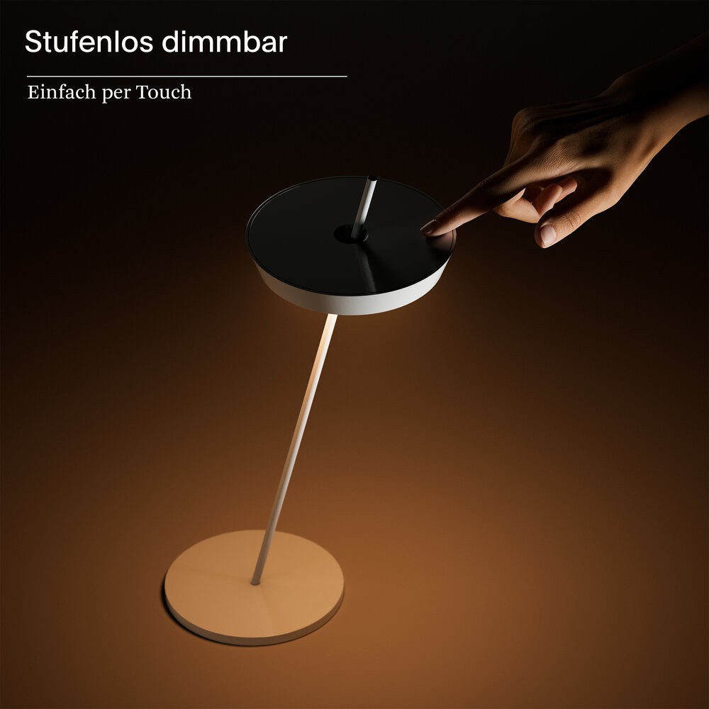 Einfache Bedienung: Die Leuchte lässt sich ganz einfach und intuitiv über den Touch-Schalter ein- und ausschalten sowie dimmen. Durch ihr hohes Eigengewicht (˜ 1 kg) hat sie einen soliden Stand.