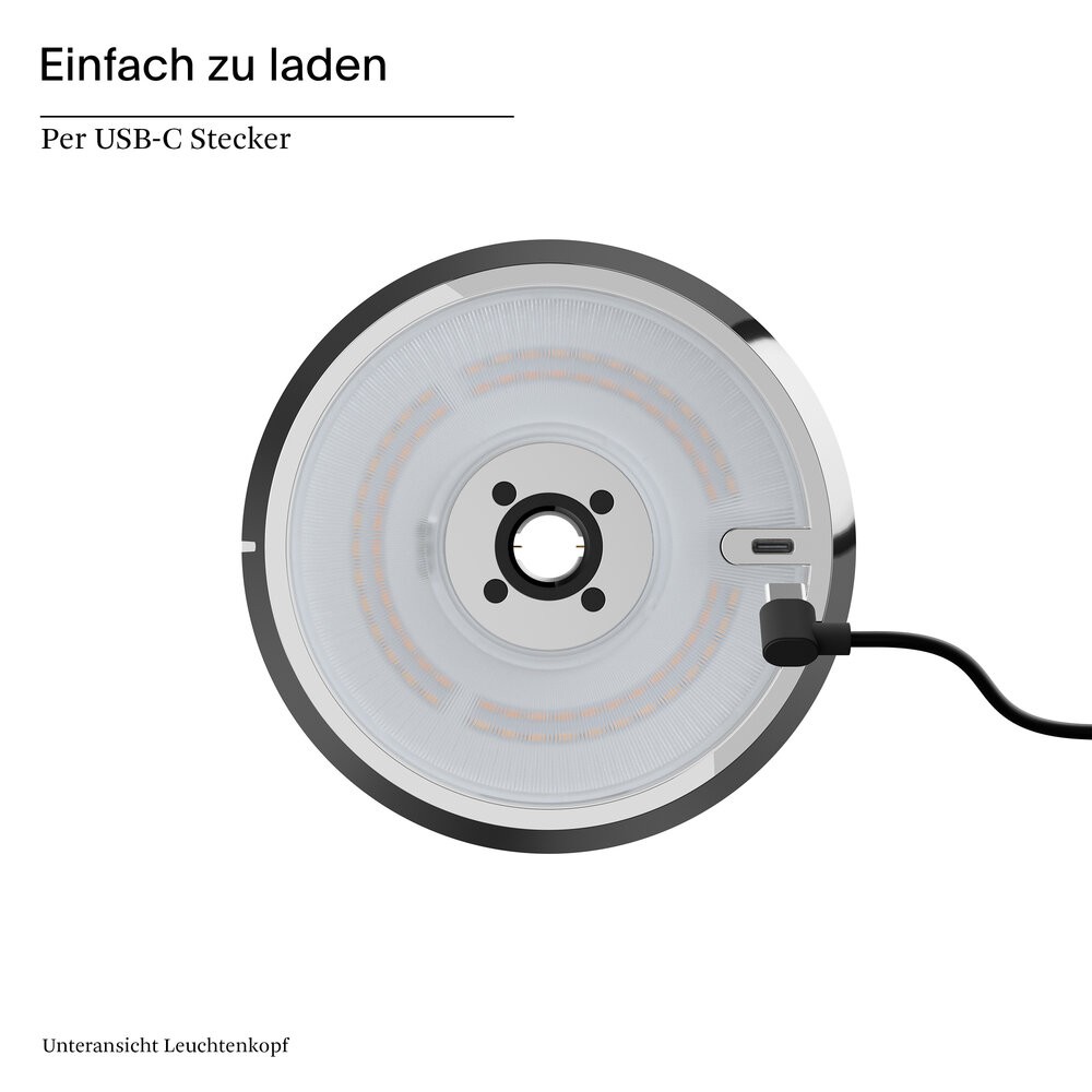 Wiederaufladbar: Mit dem beiliegenden USB-Netzteil und dem 1,2 m langen Ladekabel mit USB-C Stecker lässt sich die Akkuleuchte bequem und unkompliziert aufladen. So leuchtet sie bis zu 10 Stunden und das ganz ohne Kabel (Akku Li-Ion, 3.800 mAh).