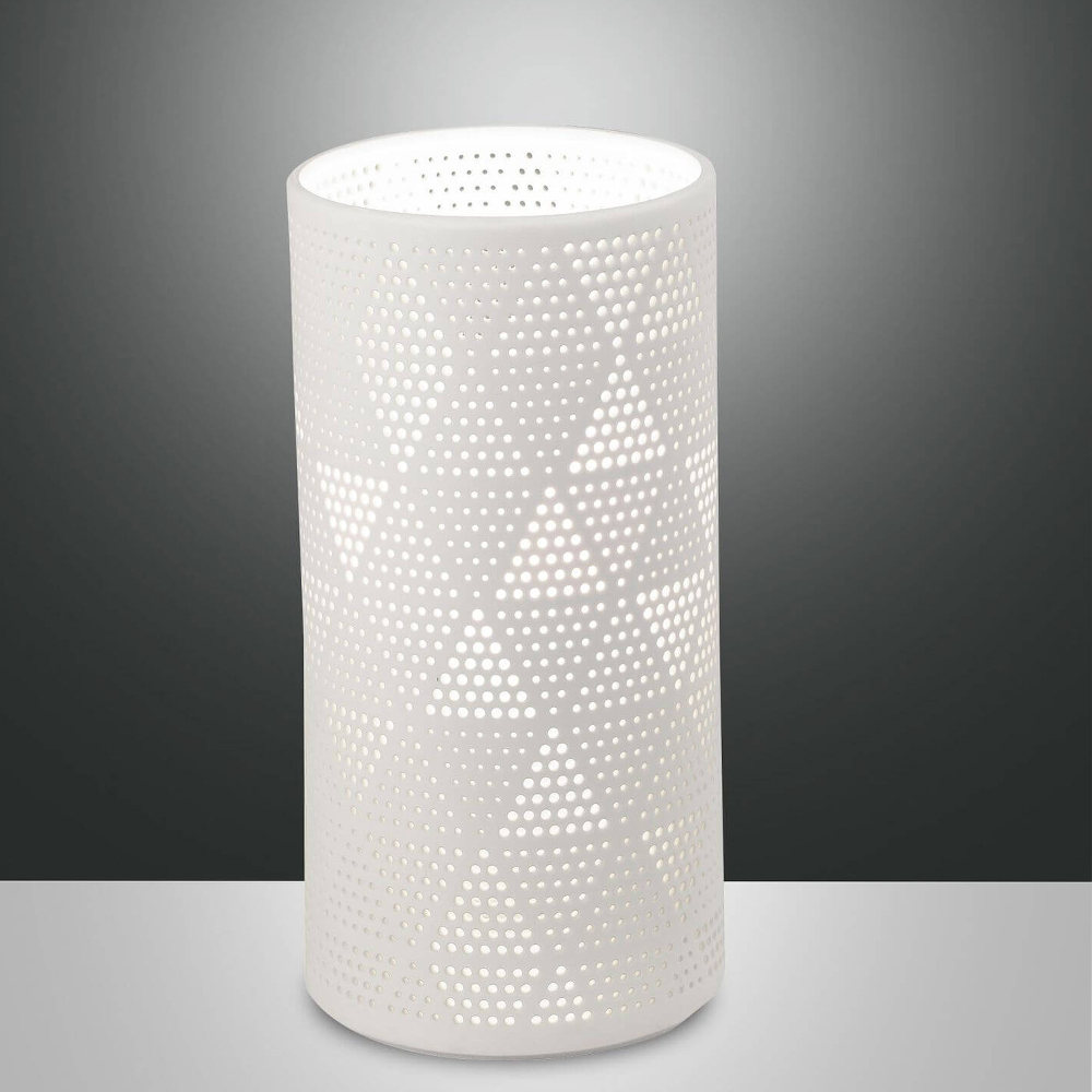 Die Tischleuchte Micol ist eine wohnliche und ausdrucksstarke handgefertigte Keramik-Tischleuchte mit einem zylindrischen, oben offenen Körper. Sie ist durchgehend von kleinen Löchern durchzogen, die in dreieckigen Segmenten zusammengefasst sind. Die effektvolle Lichtverteilung entsteht im Zusammenspiel mit einer zu verwendenden E27-Lampe.
