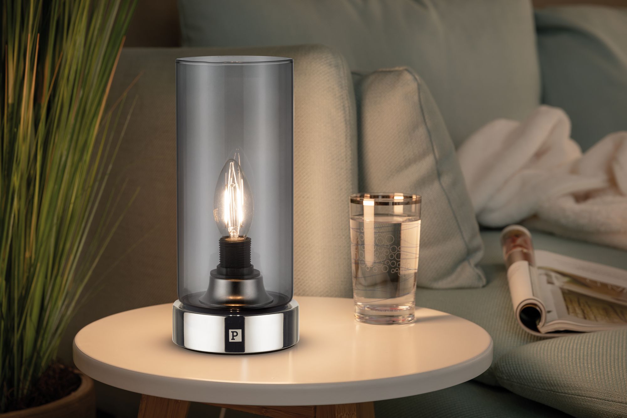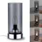 Mit chromfarbenem Sockel und Rauchglas-Schirm, wirkt diese Variante unserer beliebten Pinja edel und zeitlos. Sie eignet sich hervorragend für den Nachttisch oder als Akzentbeleuchtung. Durch Berühren des Sockels wird die Leuchte an- bzw. ausgeschaltet.