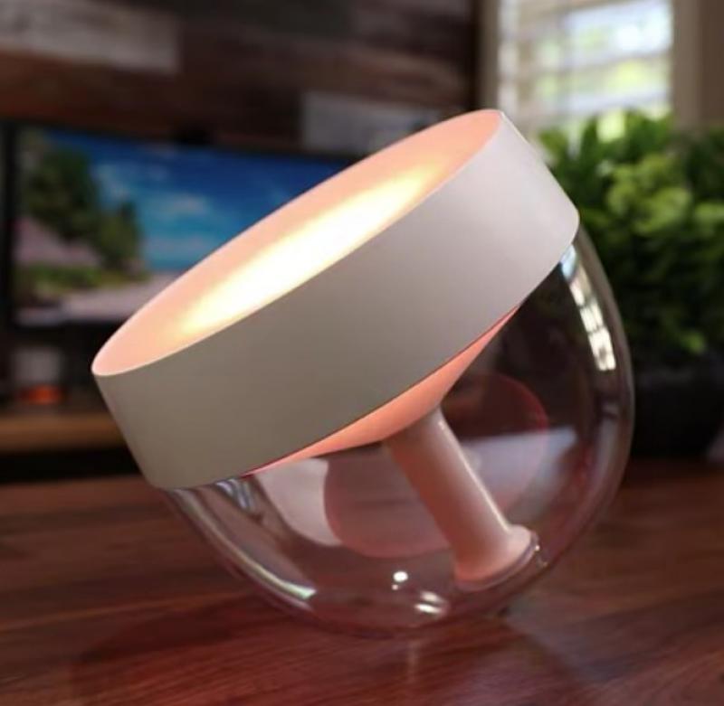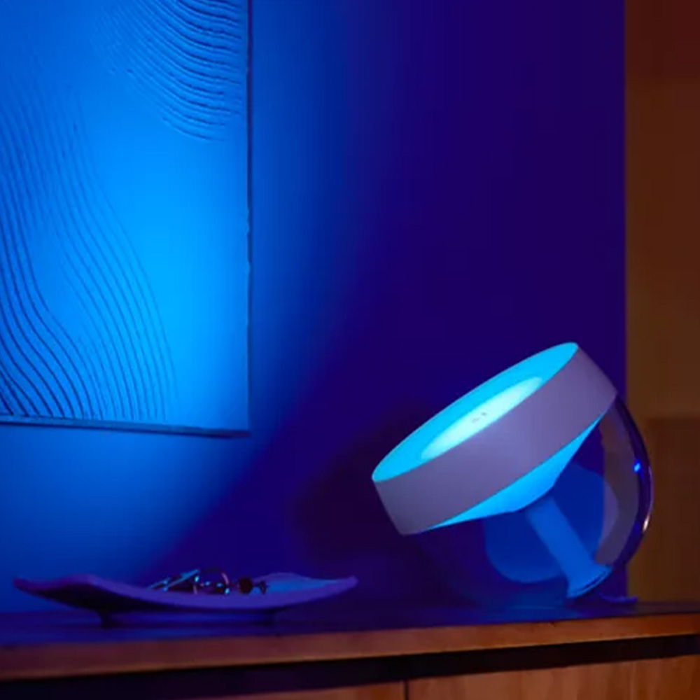 Anwendungen: Die Steuerung der transportablen Lampe ist mit der entsprechenden App über Bluetooth möglich. Zur Nutzung einer Sprachsteuerung mittels Amazon Alexa, Google Assistant, Apple HomeKit oder Microsoft Cortana ist die Verbindung mit einer extra erhältlichen Philips Hue Bridge notwendig. Durch Nutzung der Bridge ist eine Steuerung von Zuhause oder unterwegs und viele Lichtsteuerungen bei bis zu maximal 50 Leuchtmitteln im ganzen Wohnraum möglich.