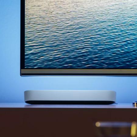 Befestige Deine Hue Play Lightbar mit dem mitgelieferten Klebeband hinter Deinem Fernseher. Platziere sie horizontal auf einer Oberfläche (beispielsweise seitlich an Deinem Fernseher), oder nutze den mitgelieferten vertikalen Ständer, um die Hue Play Lightbar aufrecht zu verwenden.