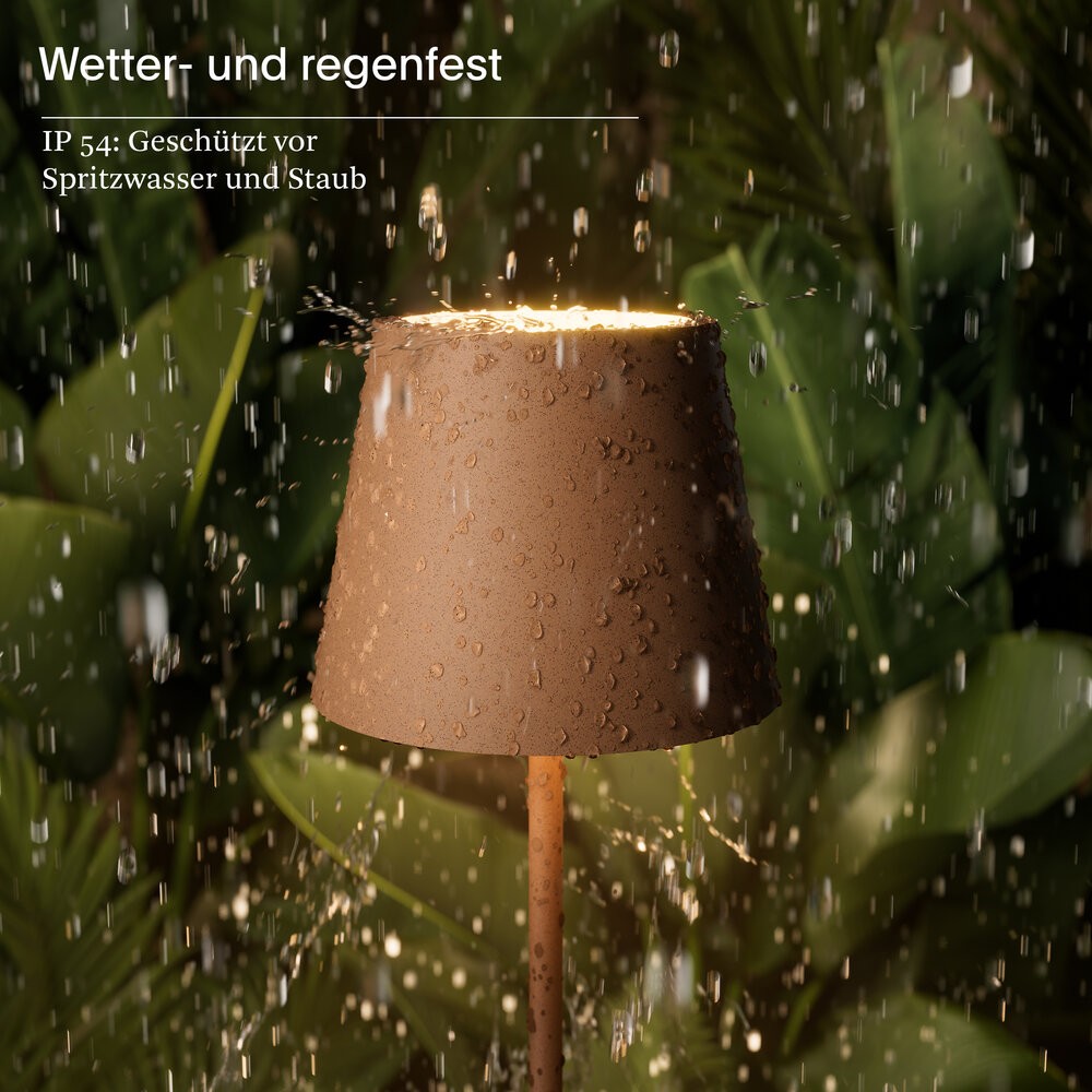 Innen & Außen: Die dimmbare Akku-Tischleuchte für den Wohn- und Außenbereich hält dank hoher Schutzart IP54 (spritzwassergeschützt) auch mal einem Regenschauer stand.