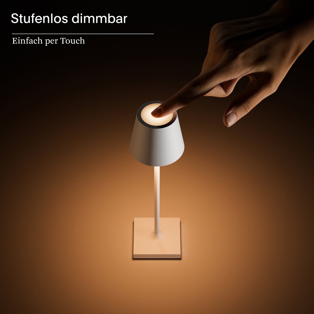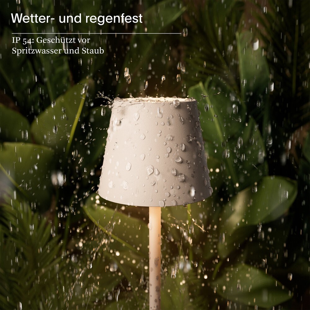 Innen & Außen: Die dimmbare Akku-Tischleuchte für den Wohn- und Außenbereich hält dank Schutzart IP54 (spritzwassergeschützt) auch Regenschauer aus.