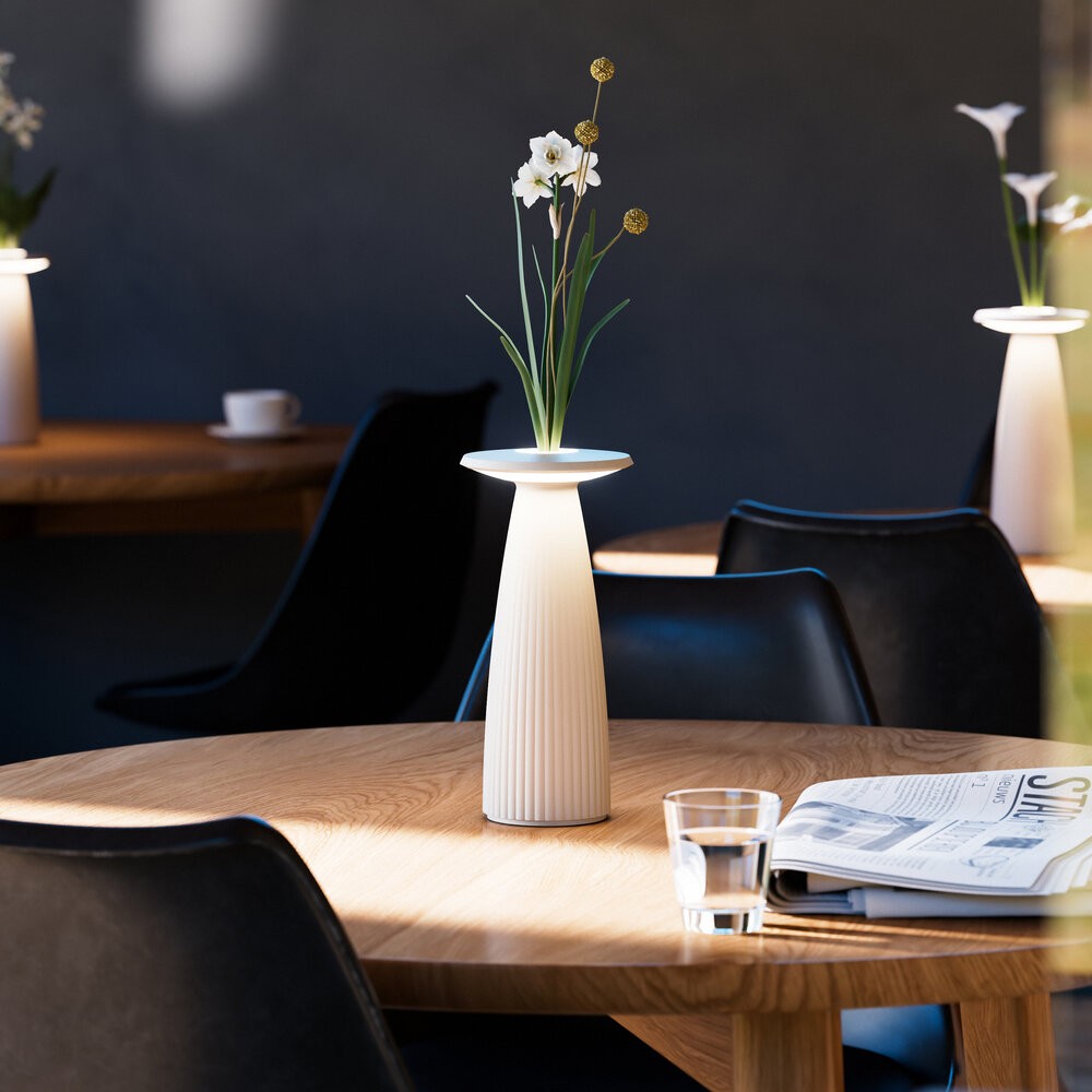 Dank des integrierten Akkus ist Nuflair absolut mobil einsetzbar. Dieser ermöglicht eine Leuchtdauer von bis zu 12 Stunden und lässt sich über das mitgelieferte Magnetkabel innerhalb von ca. 6 Stunden bequem wieder aufladen. Ein Highlight ist der Vaseneinsatz, der von oben in die Lampe eingesetzt wird und sogar mit Wasser befüllt werden kann. So kann jederzeit eine Blume in die Tischleuchte integriert werden. Nuflair ist ideal für Restaurants sehr interessant, wo sie aufgrund IP54 auch im Außenbereich eingesetzt werden kann.