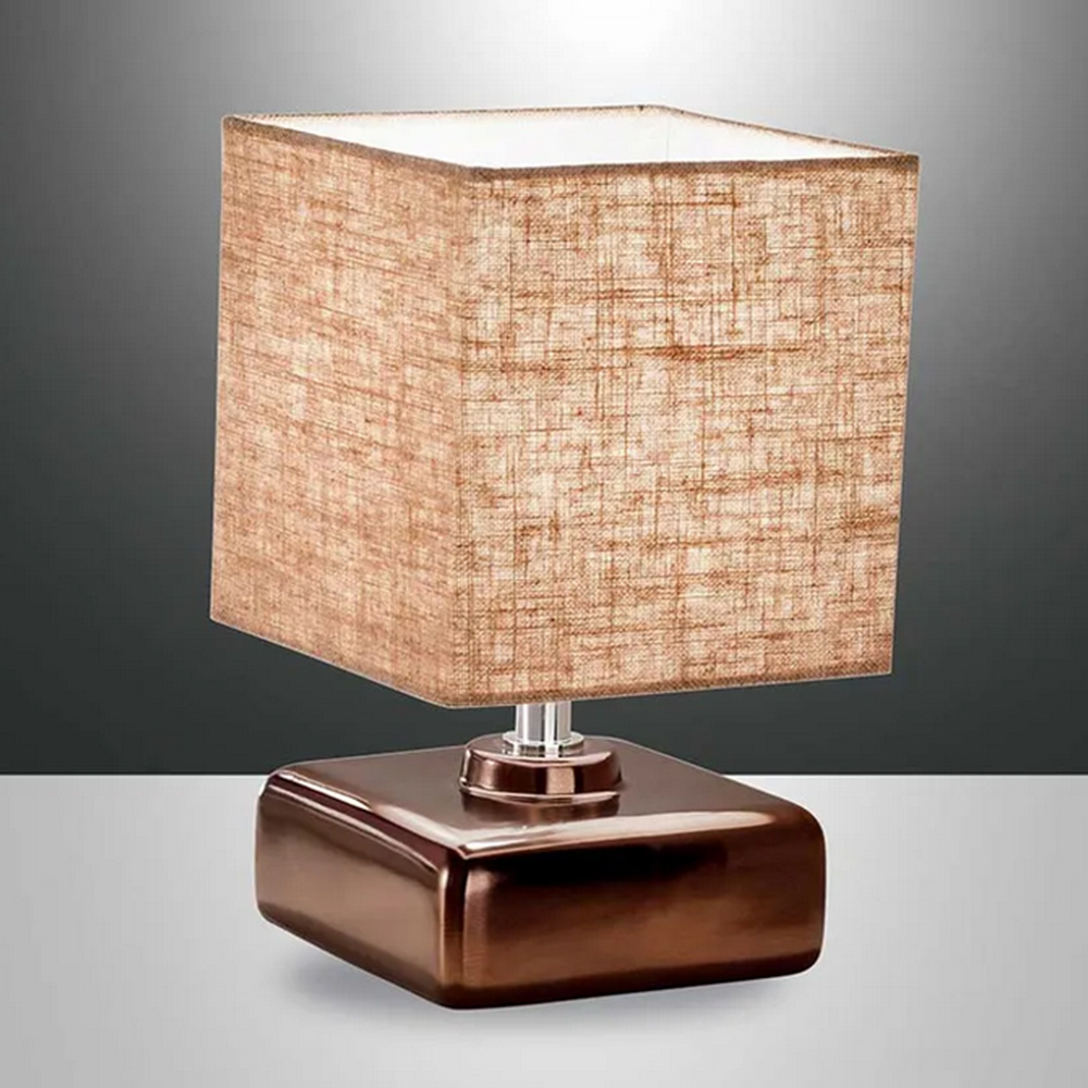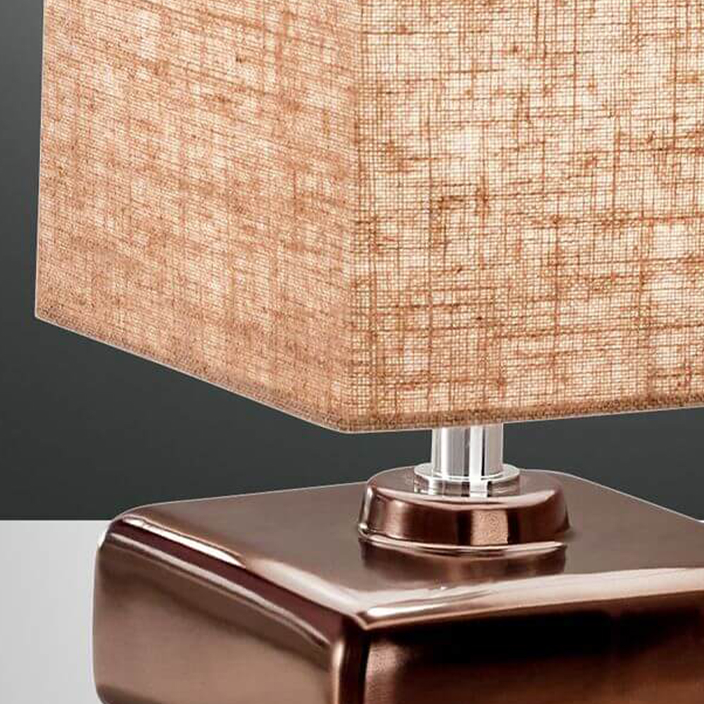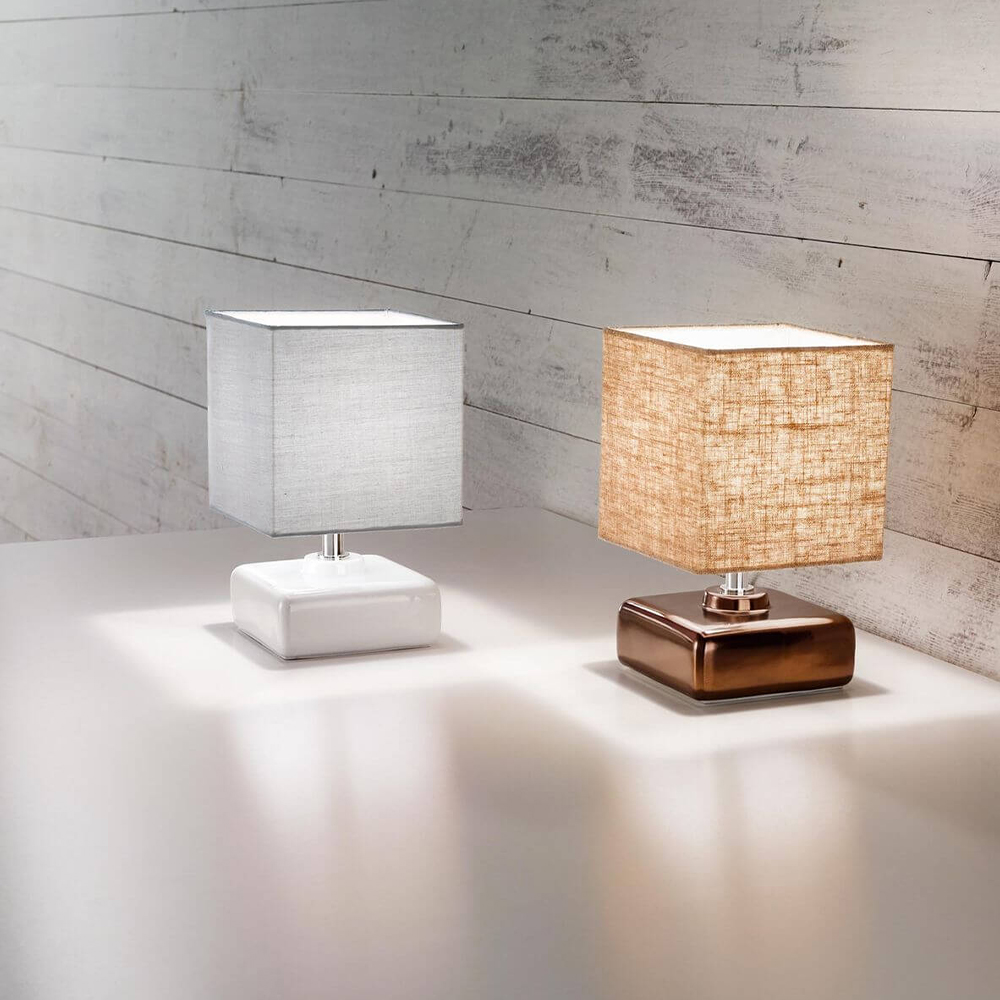 Die Lampe hat einen glasierten weißen Sockel und einen würfelförmigen Textilschirm. Sie wird mit einer E14-Fassung geliefert, so dass Sie eine beliebige E14-Lampe für Ihre individuellen Lichtbedürfnisse wählen können.