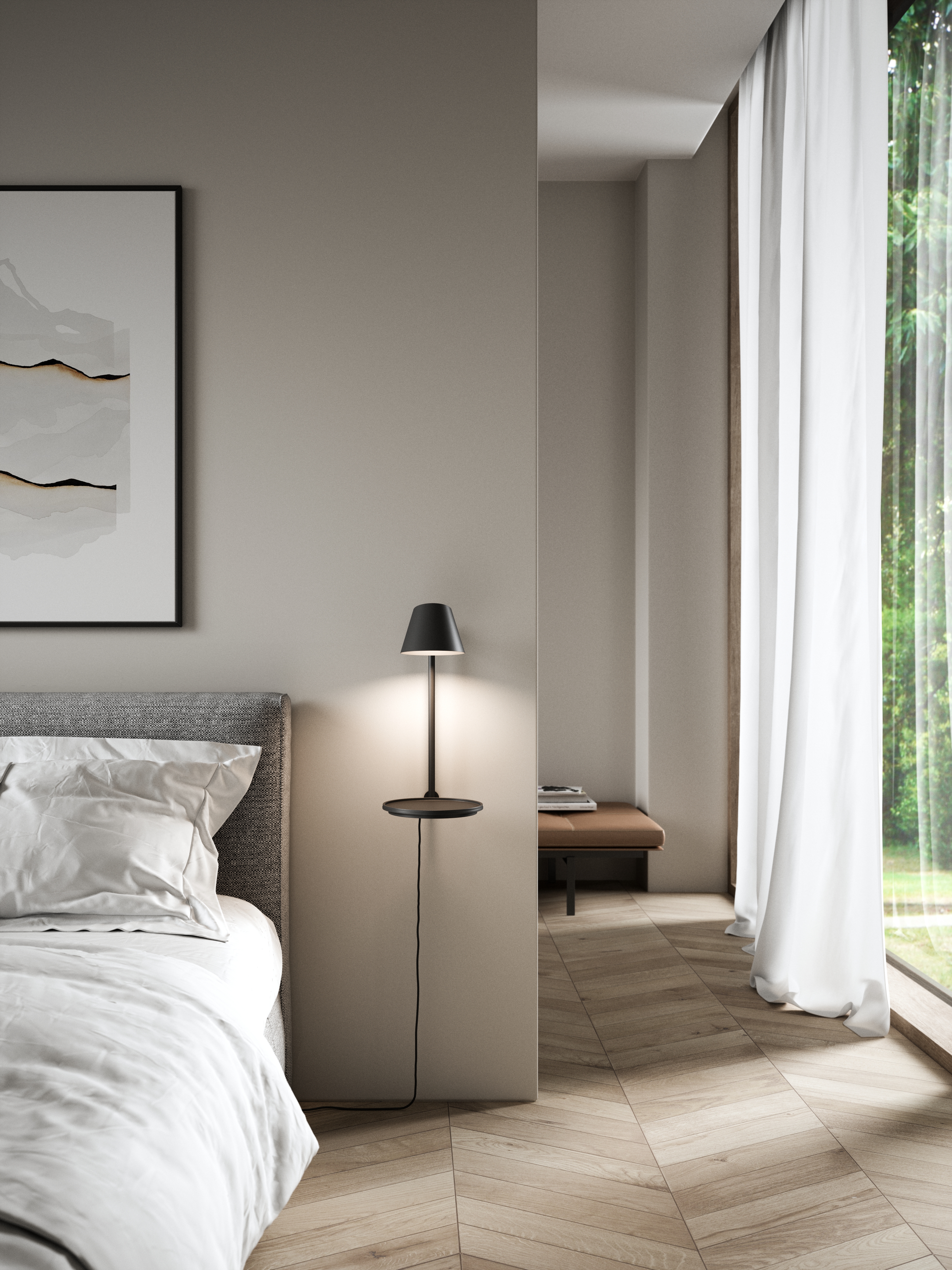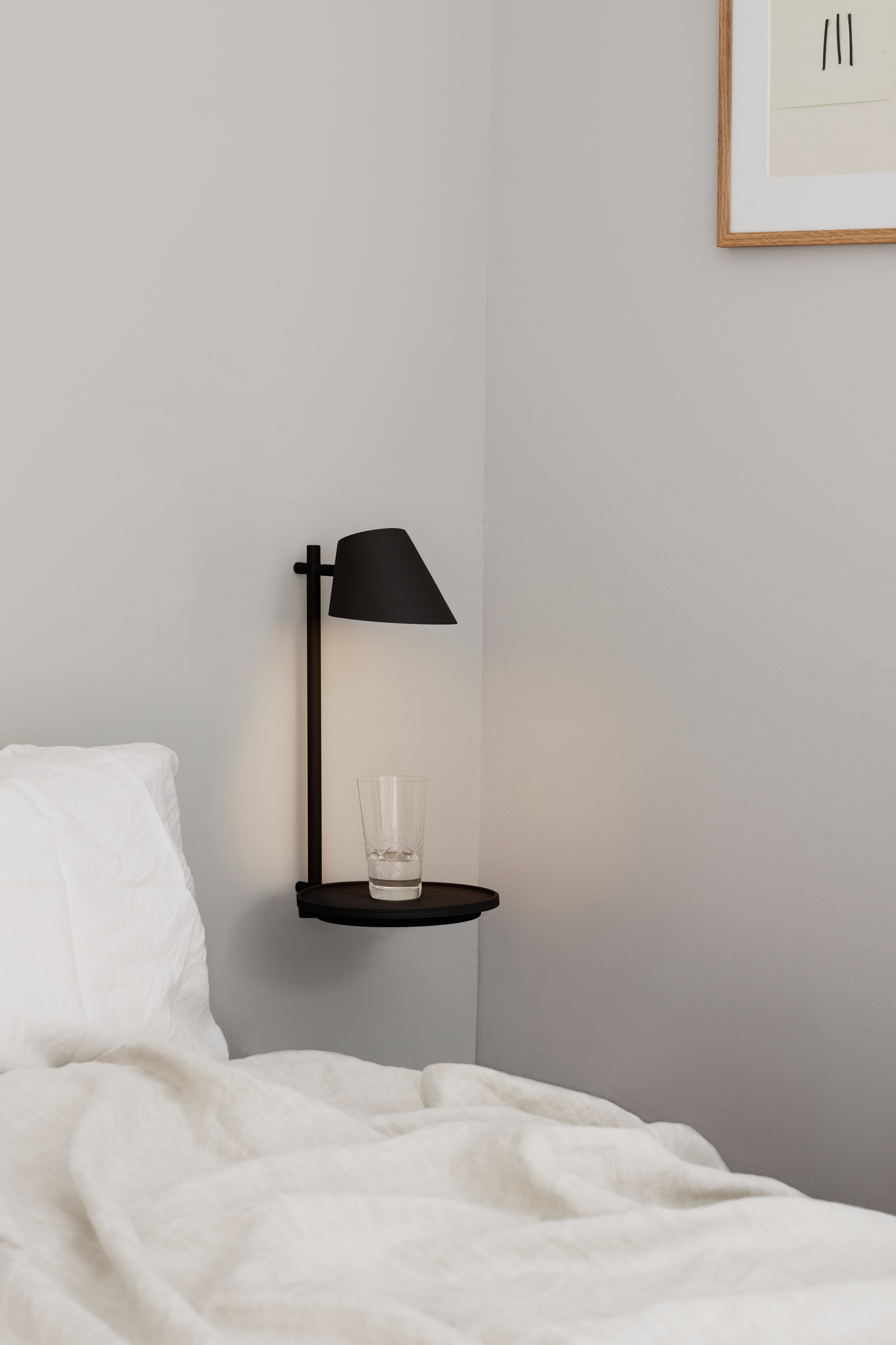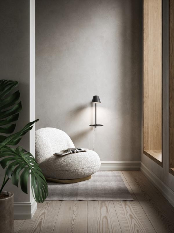 Stay wurde von der dänischen Designerin Maria Berntsen entworfen und ist eine spannende Alternative zur klassischen Wandleuchte, denn mit ihrem funktionalen und schwebenden Design sorgt sie für eine besondere, schöne Beleuchtung. Die Leuchte verfügt über einen hohen funktionalen Wert, da die Platte als Ablage fungiert und die Ladestation via USB-Anschluss sowie der Lampenschirm gedreht werden können. Die Leuchte ist mit eingebauter LED erhältlich und sie verfügt über ein kleines, dezentes Detail in Form eines Ein-Aus-Schalters, der in die Platte selbst integriert ist. Das seidenmatte Metall in Schwarz trägt auf besonders schöne Weise zur modernen und minimalistischen Optik bei.