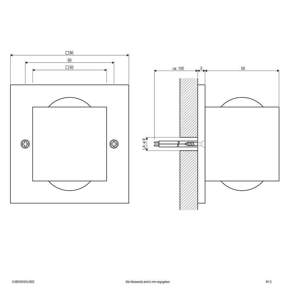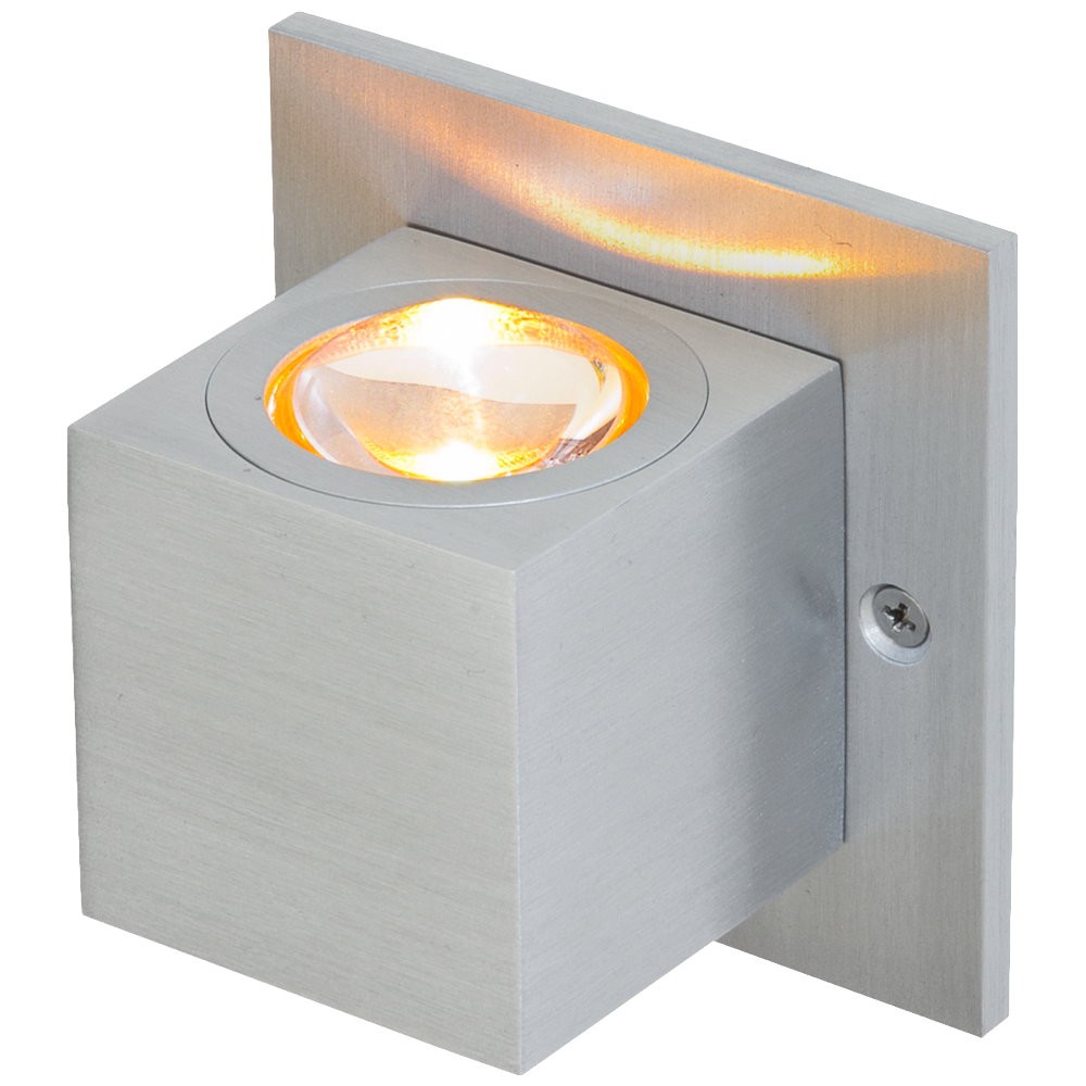 LED-Wandanbauleuchte für vielfältige Anwendungen im Innenbereich. Die Leuchte besteht aus einer Alu-Montageplatte und dem aufgesetztem Cube, welcher aus einem Block gefräst wurde. Oben und Unten wurde in die Lichtaustrittsöffnungen jeweils eine optische Linse eingelassen, durch welche das Licht gebündelt wird. Durch die dadurch entstehenden Lichtkegel schaffen Sie ein absolutes Highlight in jedem Raum. Die angegebenen Lumen werden natürlich je LED-Chip erreicht. Die Einzelmaße sind wie folgt: Montageplatte: 80x80x5mm, Cube (ohne Linsen): 50x50x50mm. Die Leuchte kann auch auf Schalterdosen montiert werden, wodurch auch eine Montage in Massivwänden ohne Probleme möglich ist. Da die beiden LED-Chips nicht einzeln an das Vorschaltgerät angeschlossen werden können, muss bei der Wahl dessen die Gesamtleistung je Leuchte von 5,2W berücksichtigt werden.